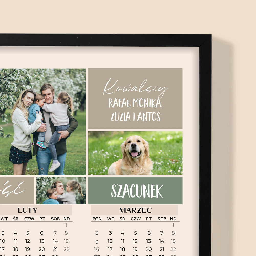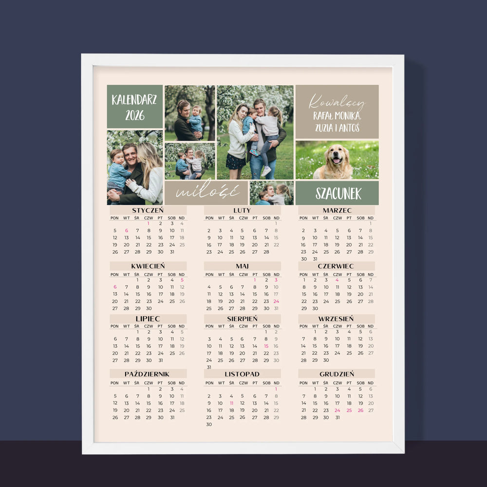 Fotokalendarz oprawiony w ramkę z wybranymi przez Ciebie zdjęciami.