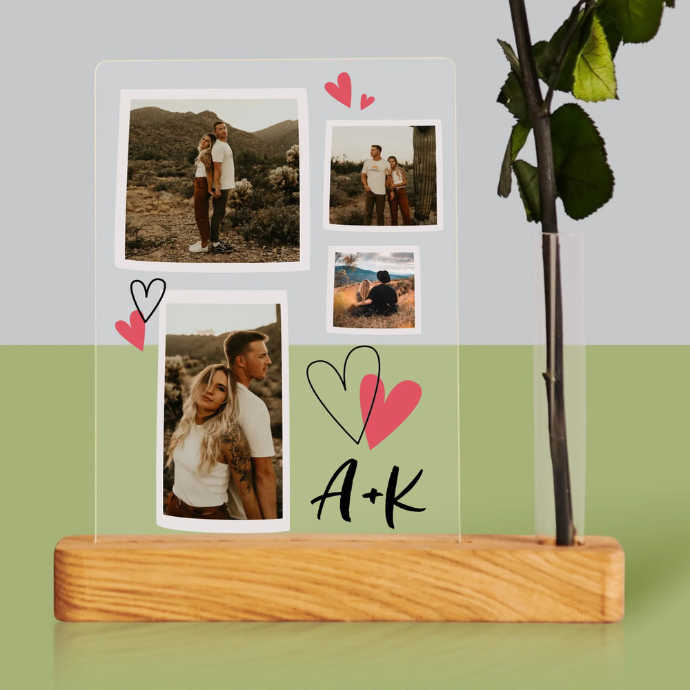 Dołączona róża w małym wazonie w kształcie probówki, umieszczonym w podstawce razem z wydrukiem na szkle akrylowym.