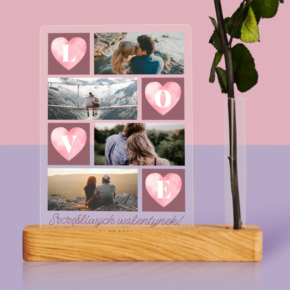 Fotokolaż: Serduszka Love - Wydruk na szkle akrylowym z różą