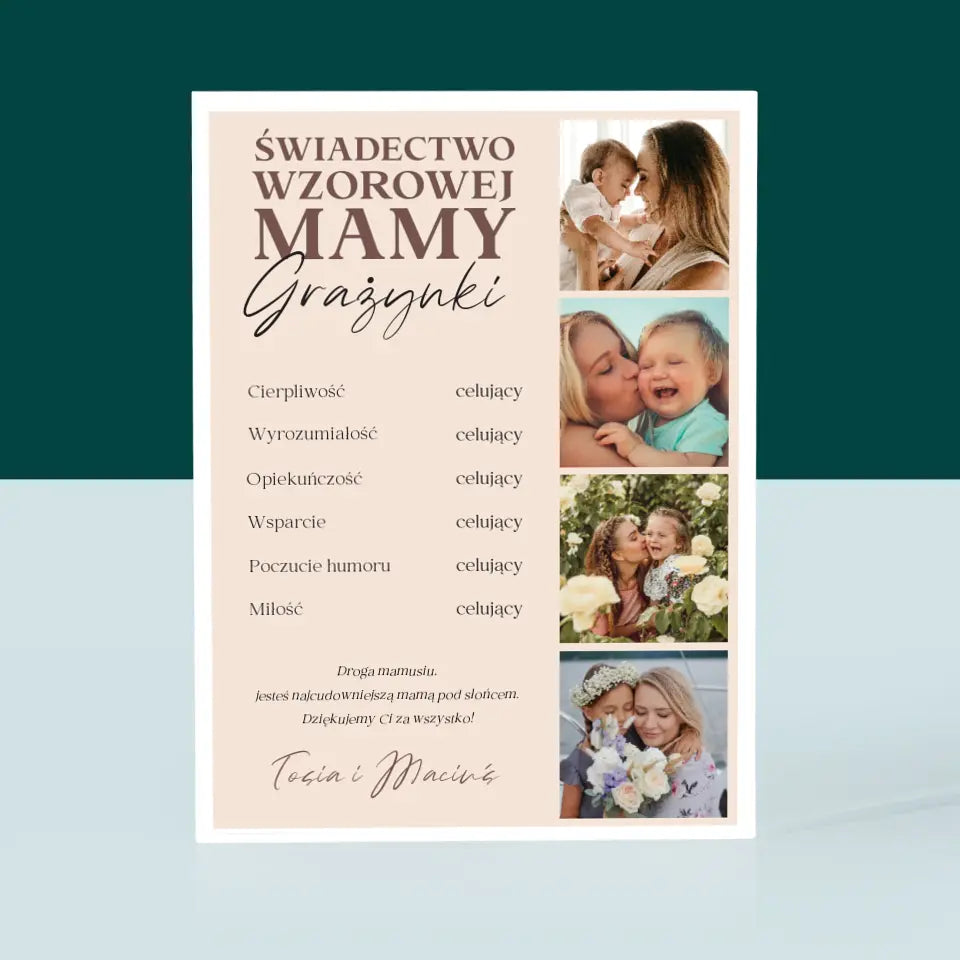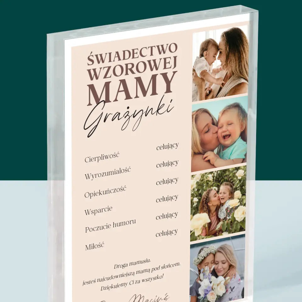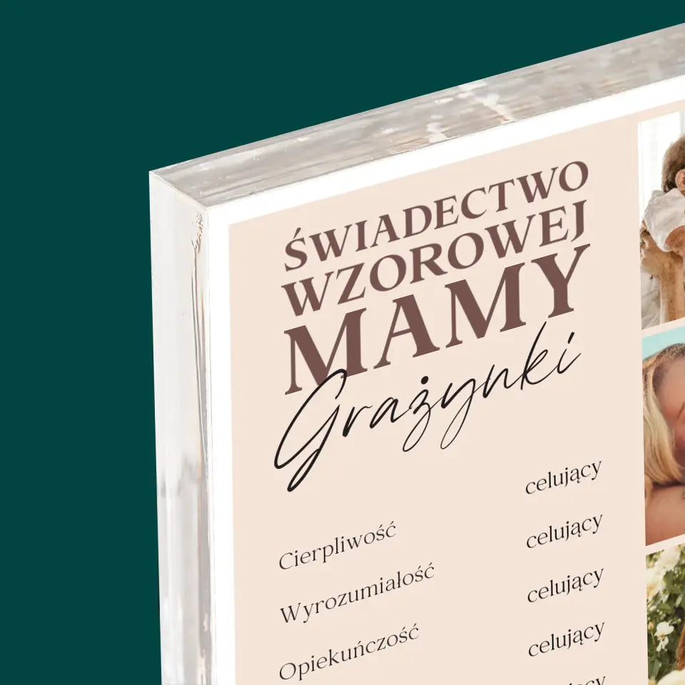Fotokolaż: Świadectwo Wzorowej Mamy - Blok Akrylowy z Nadrukiem