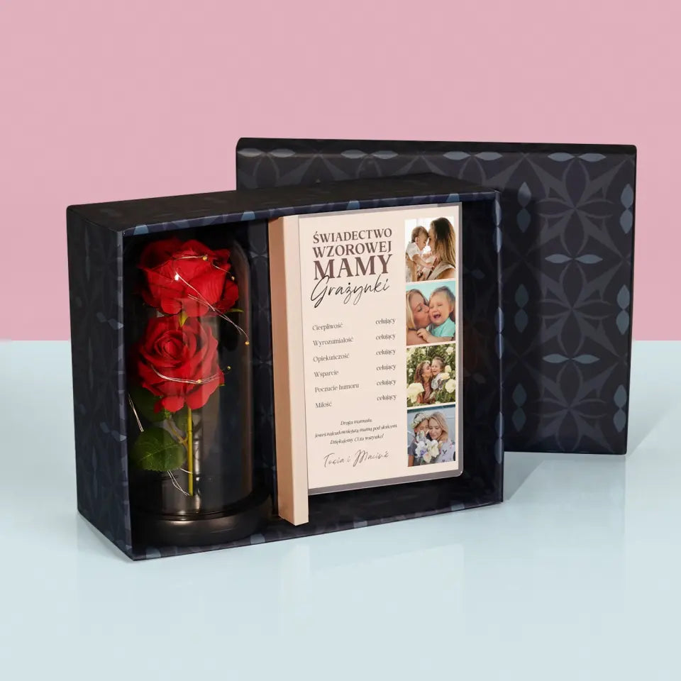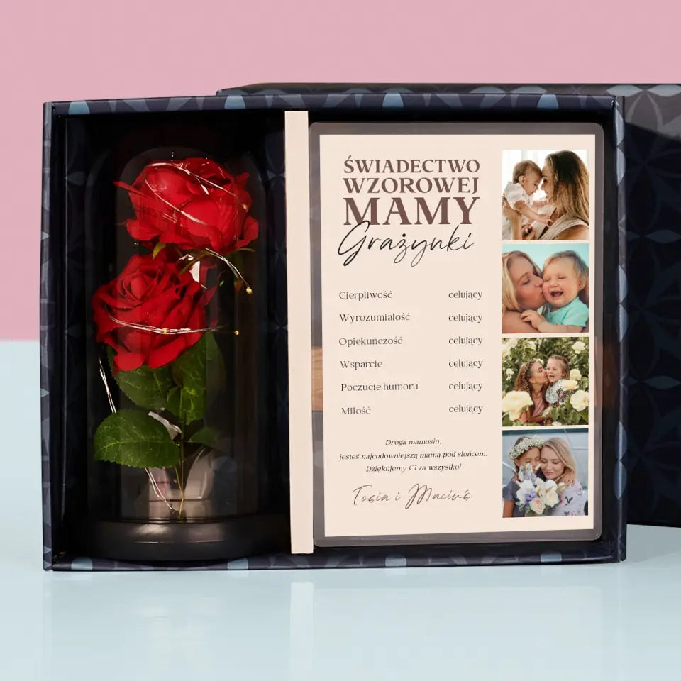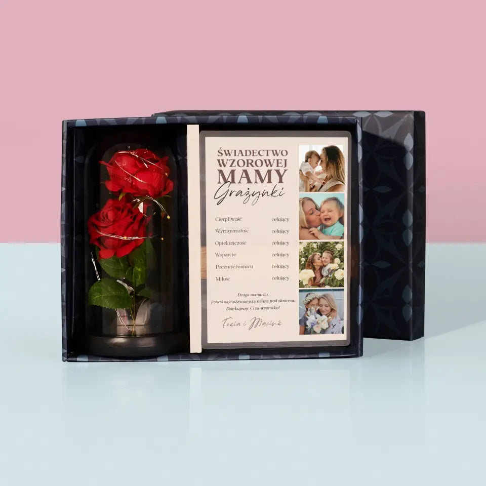 Fotokolaż: Świadectwo Wzorowej Mamy - Zestaw prezentowy z wieczną różą