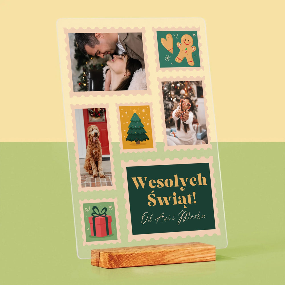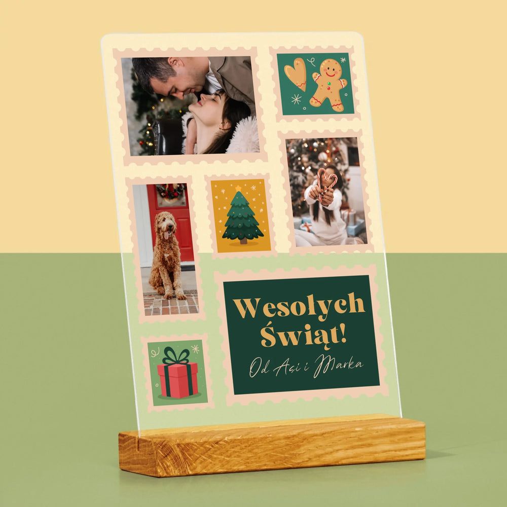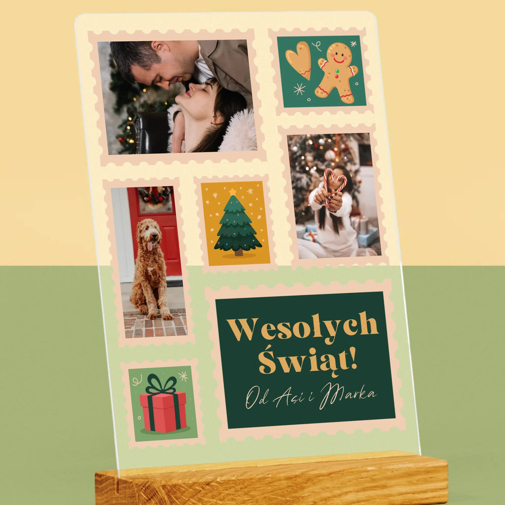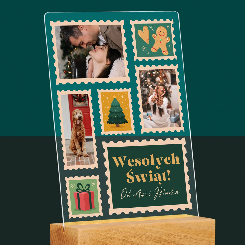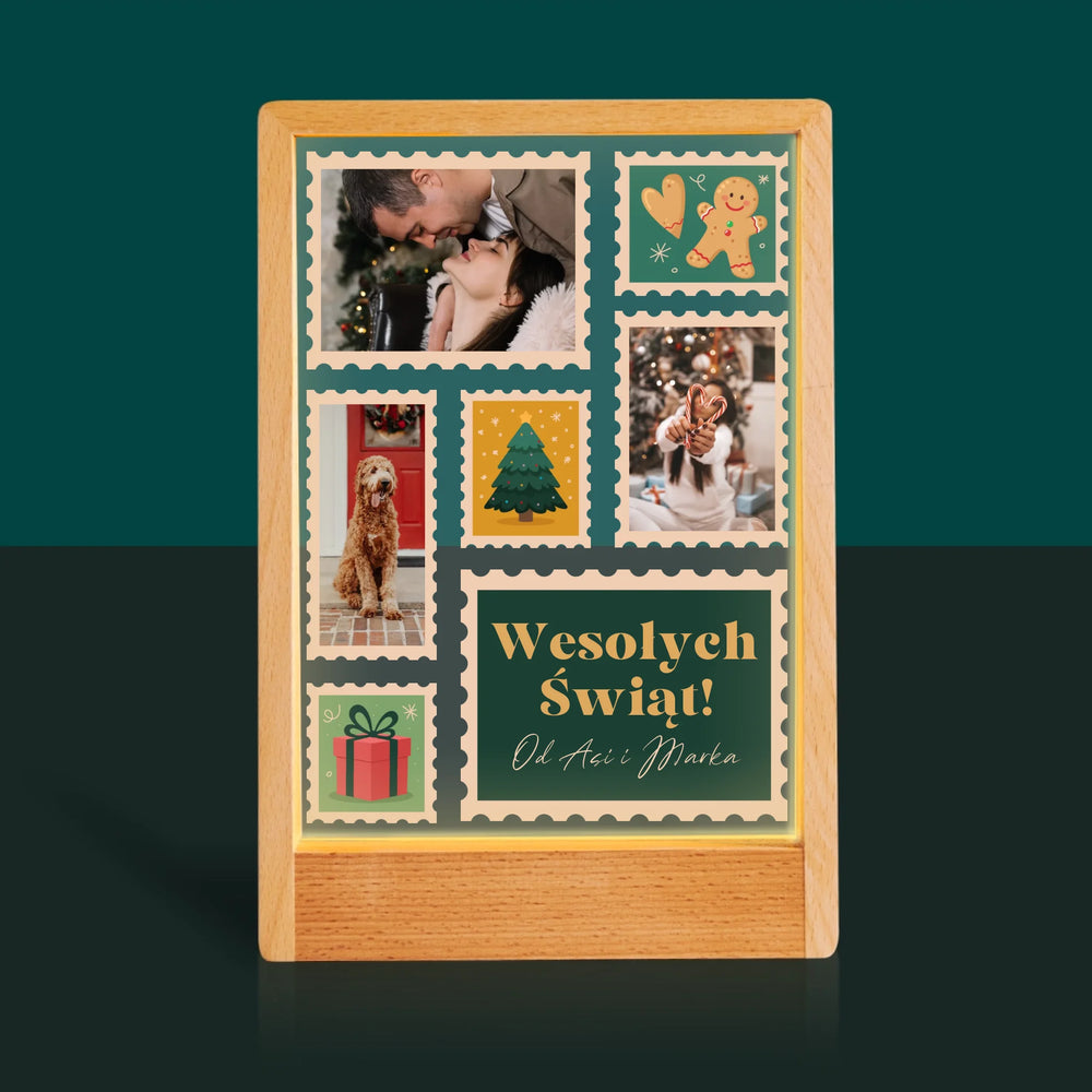 Fotokolaż: Świąteczne Znaczki Pocztowe - Wydruk na szkle akrylowym w ramce LED