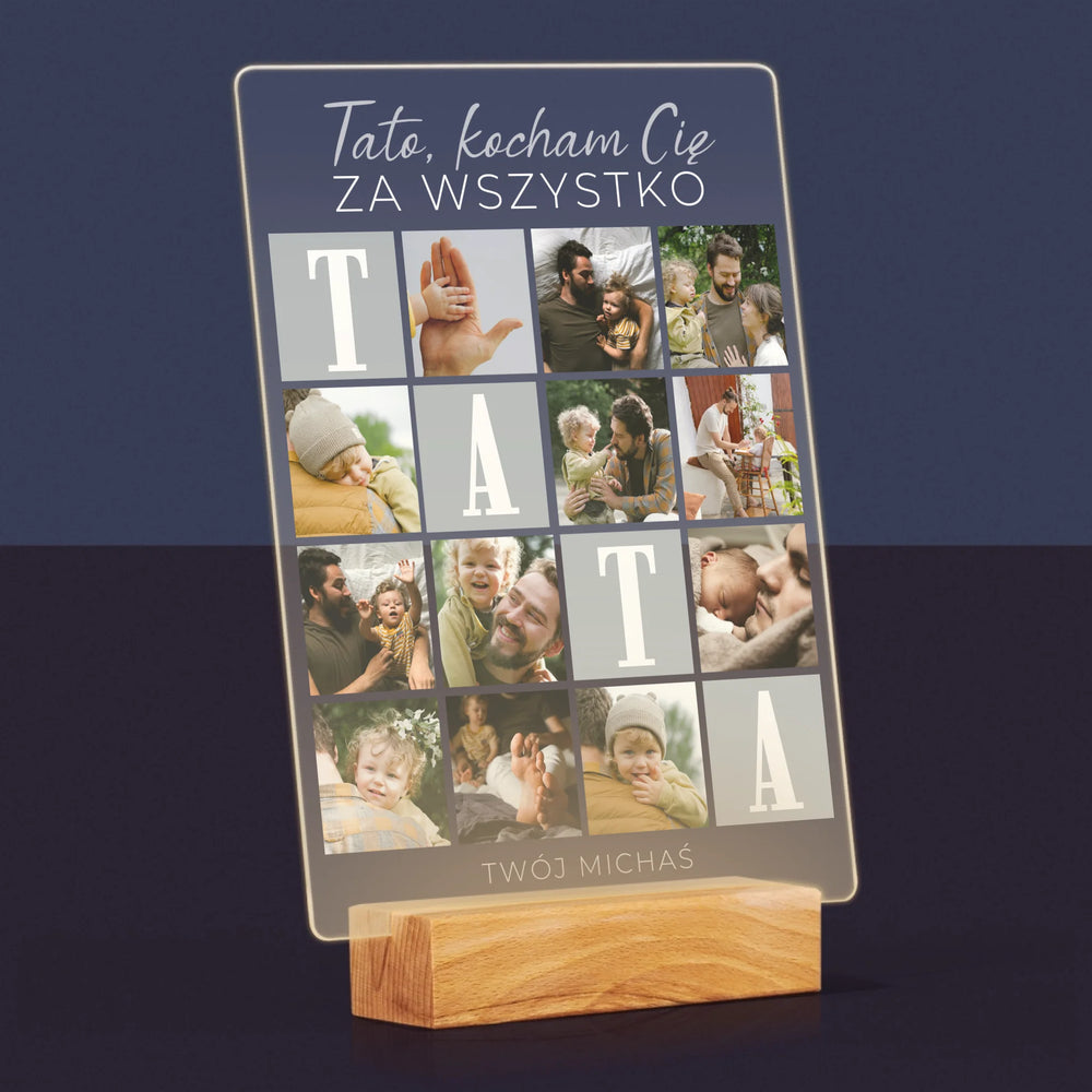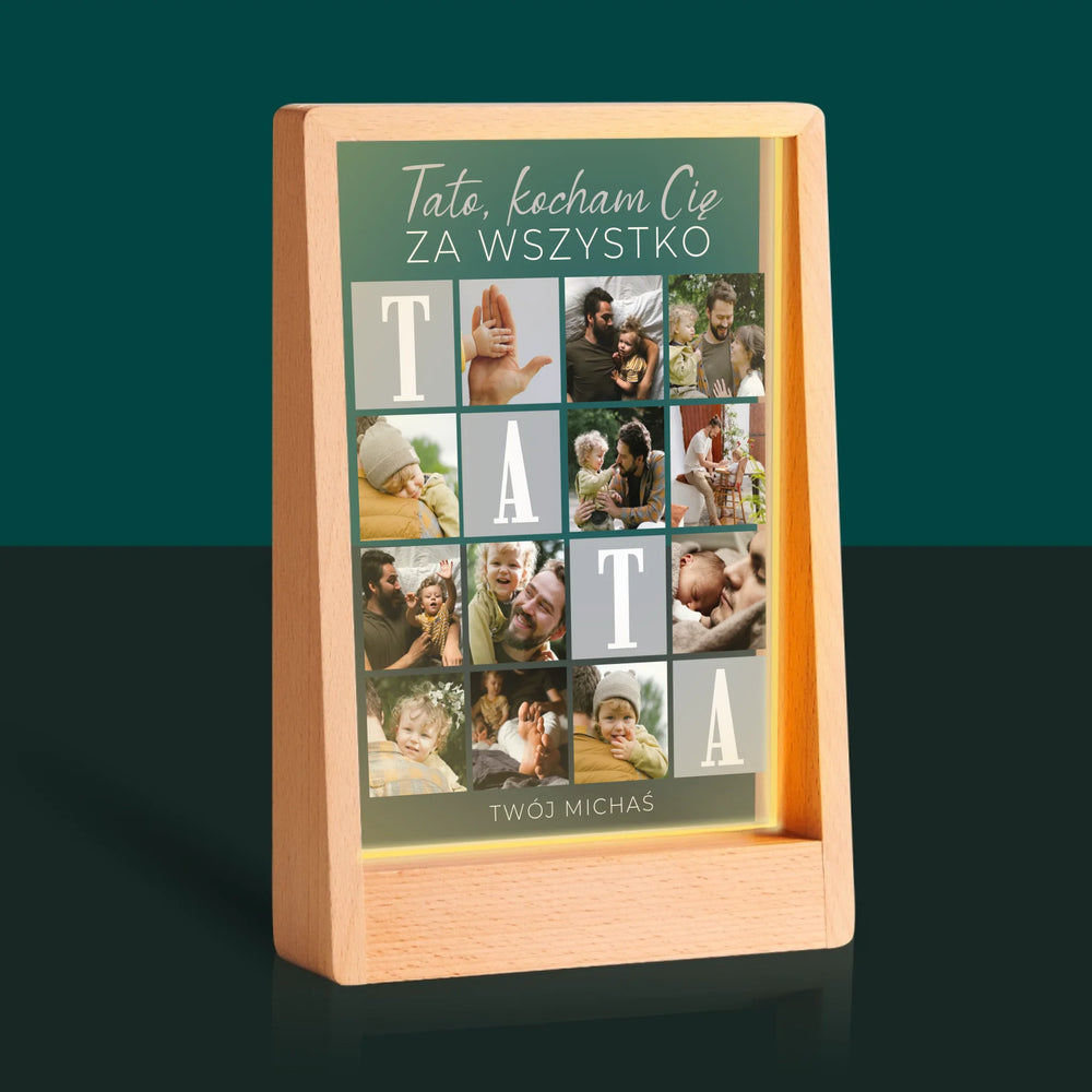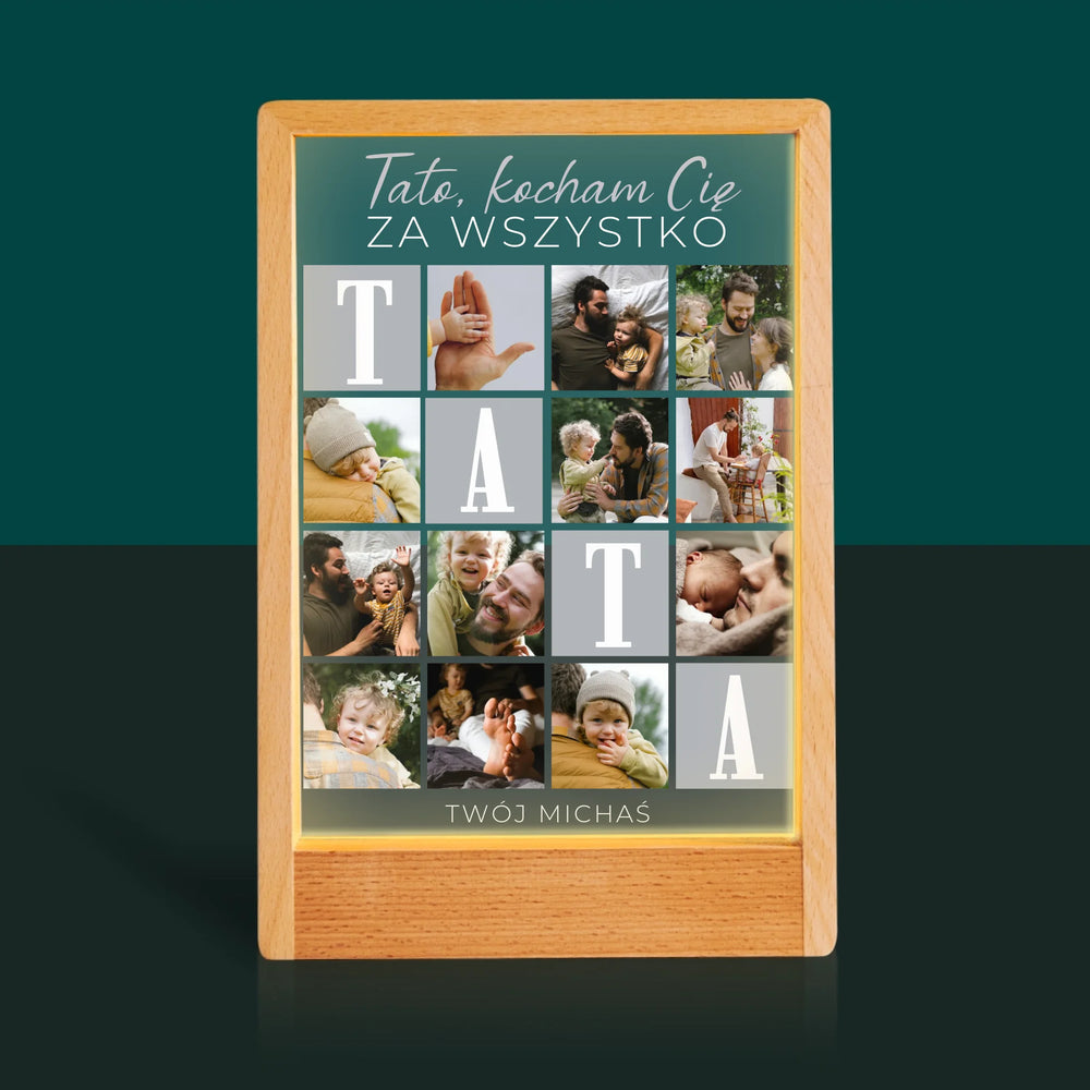 Fotokolaż: Tato Kocham Cię Za Wszystko - Wydruk na szkle akrylowym w ramce LED