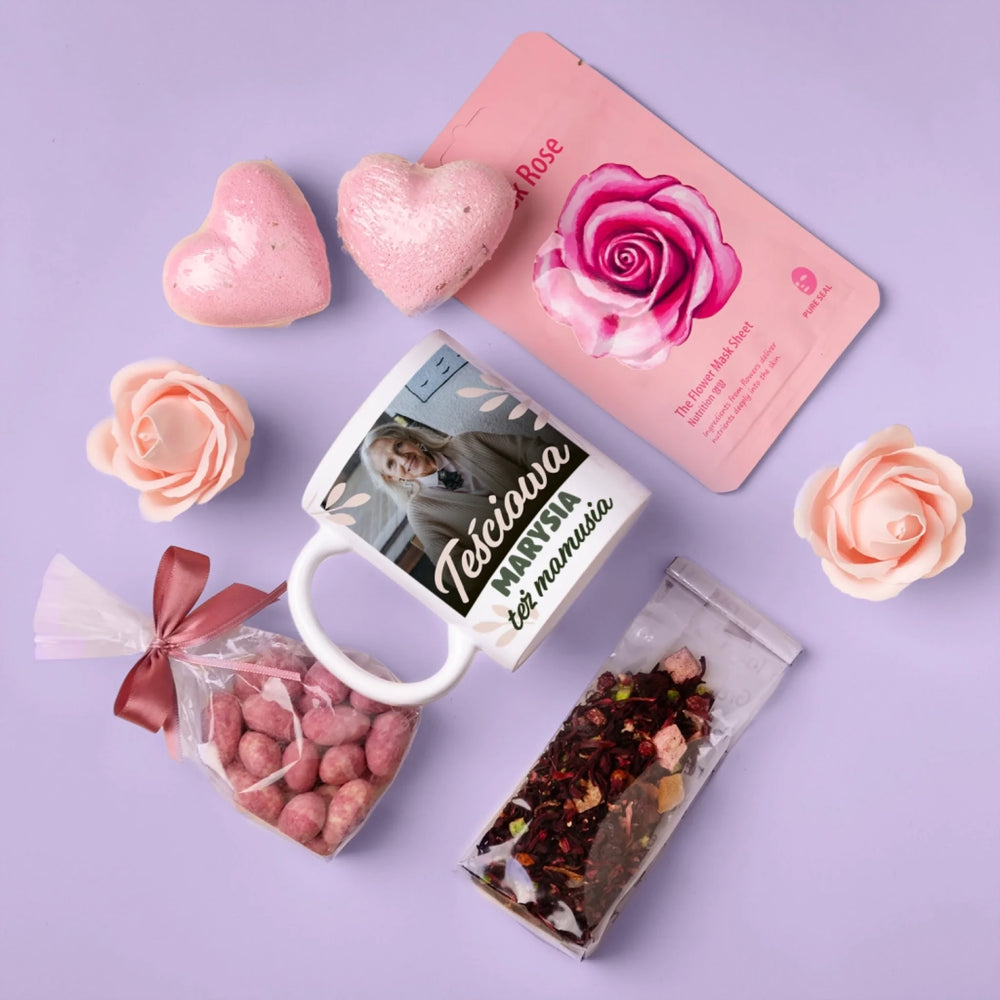 - Piękny zestaw prezentowy z kubkiem z wybraną przez Ciebie personalizacją oraz dodatkami niezbędnymi do różanego spa.