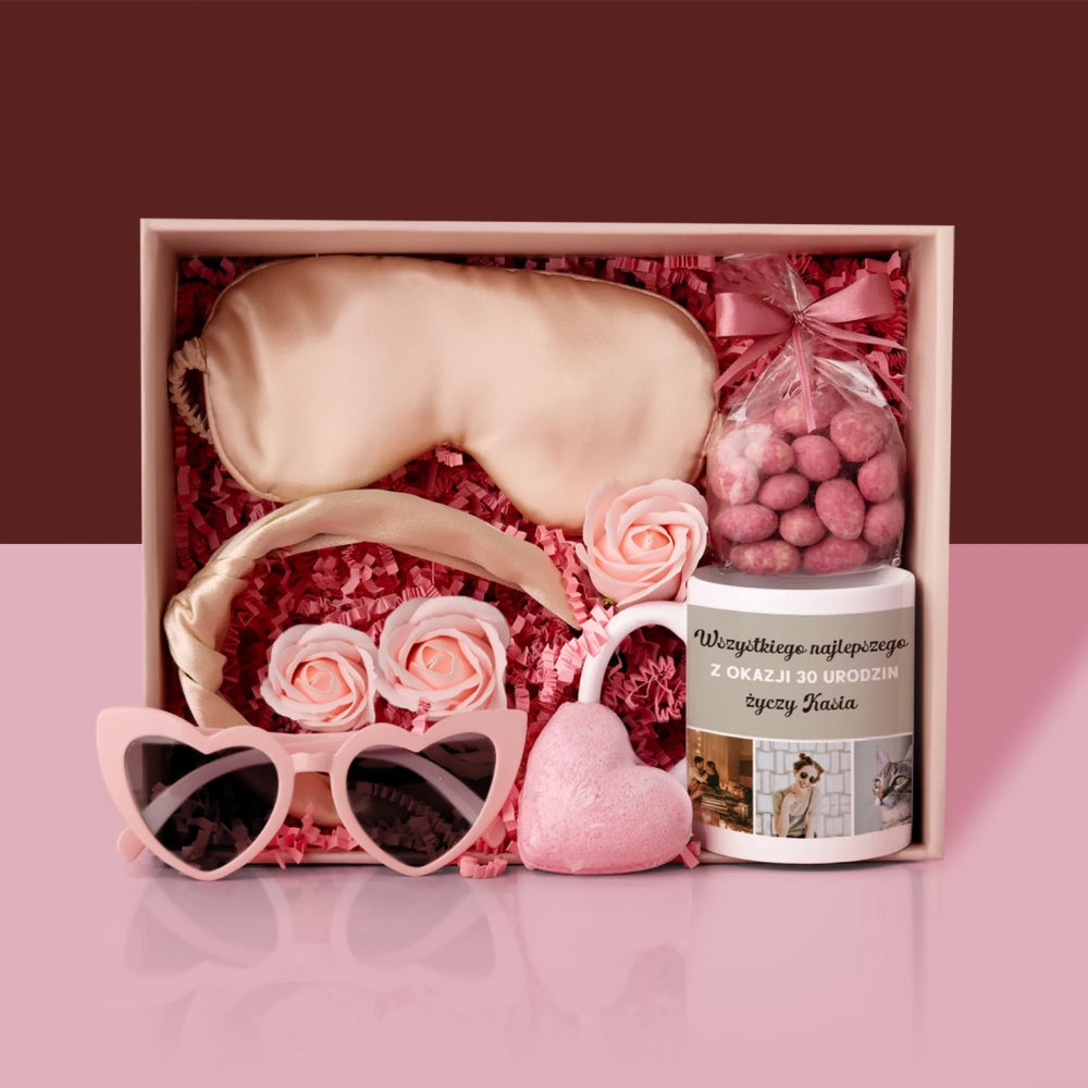 W zestawie znajdują się migdały w czekoladzie, kula do kąpieli w kształcie serca, opaska na oczy, okulary w kształcie serca oraz róże mydlane.