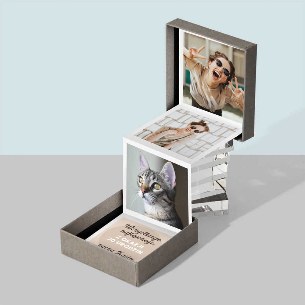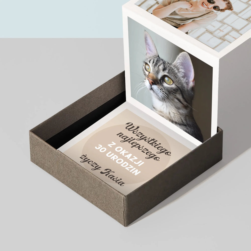 Harmonijka składa się z trzech zdjęć o wymiarach 6,68 x 6,68 cm oraz z personalizowanej karteczki z dedykacją dla obdarowanej osoby