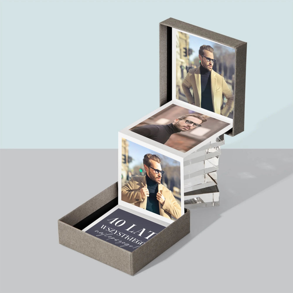 Harmonijka składa się z trzech zdjęć o wymiarach 6,68 x 6,68 cm oraz z personalizowanej karteczki z dedykacją dla obdarowanej osoby