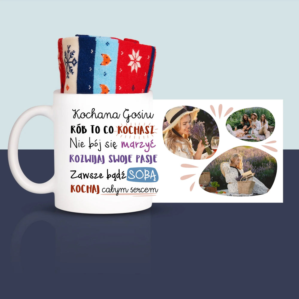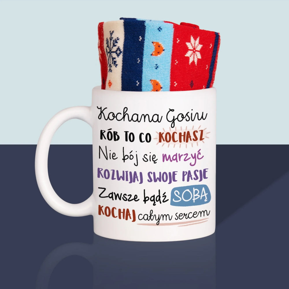 Wysokiej jakości kubek z wybraną przez Ciebie personalizacją ze skarpetkami w środku.