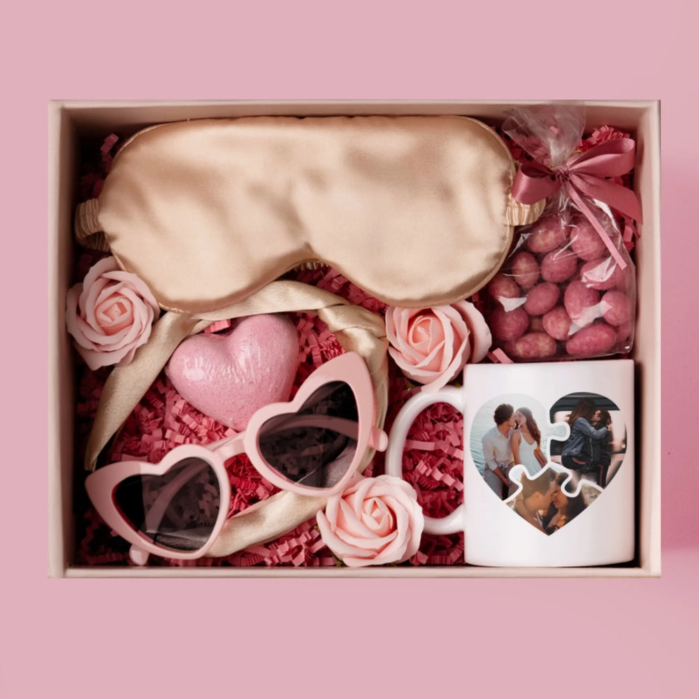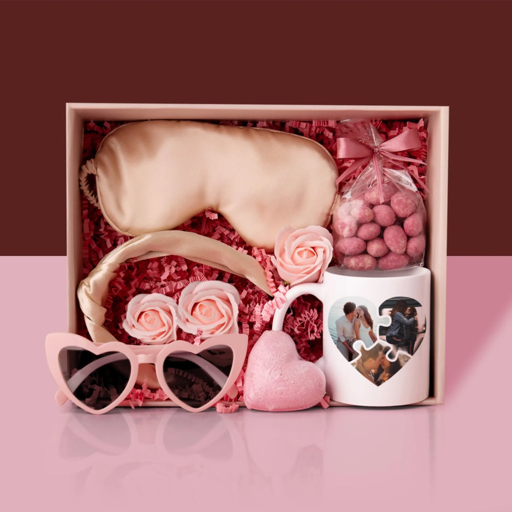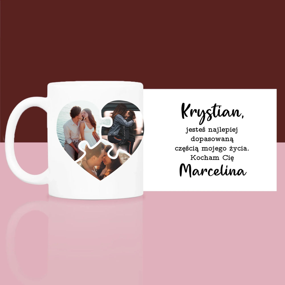 Fotokolaż: Walentynkowe Puzzle - Zestaw prezentowy z kubkiem i satynową opaską