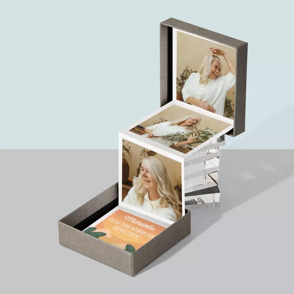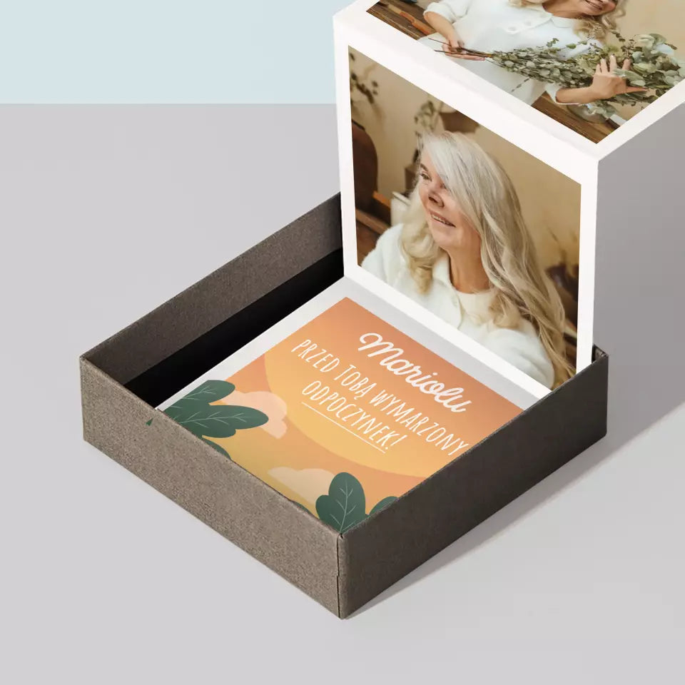 - Harmonijka składa się z trzech zdjęć o wymiarach 6,68 x 6,68 cm oraz z personalizowanej karteczki z dedykacją dla obdarowanej osoby