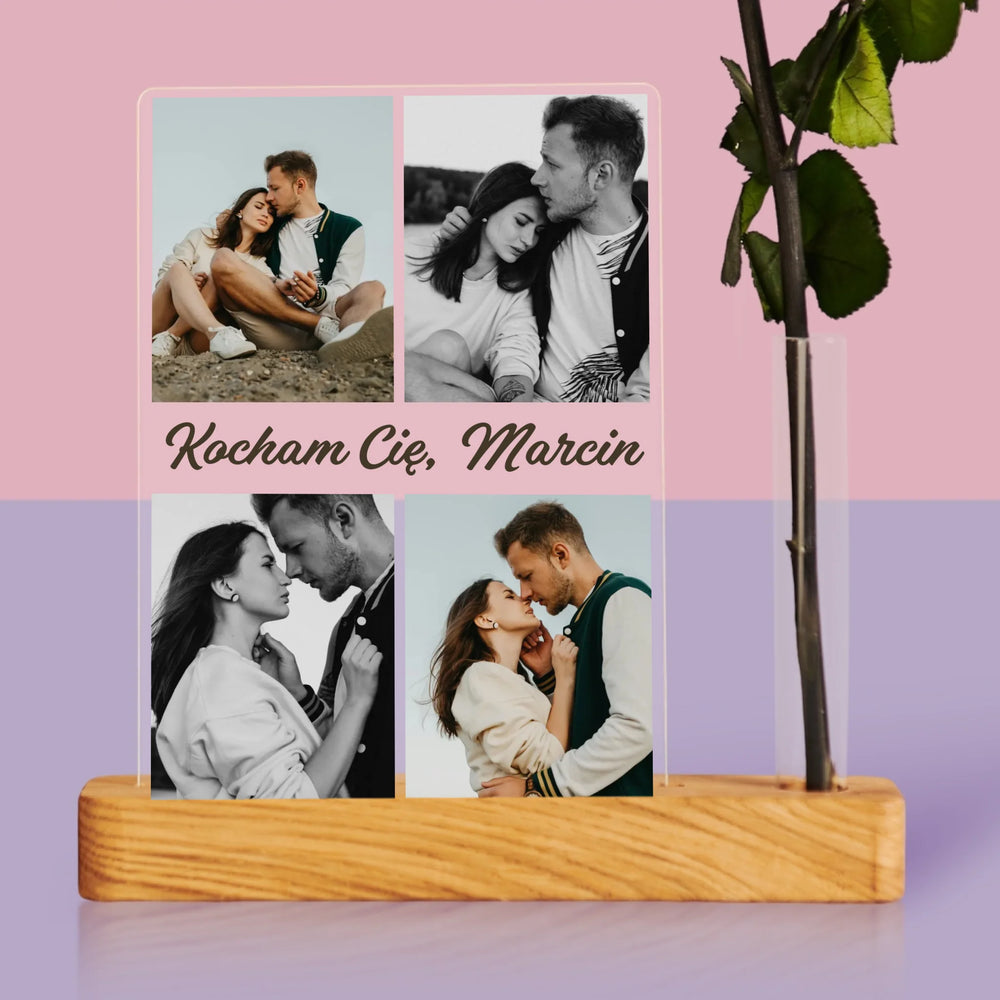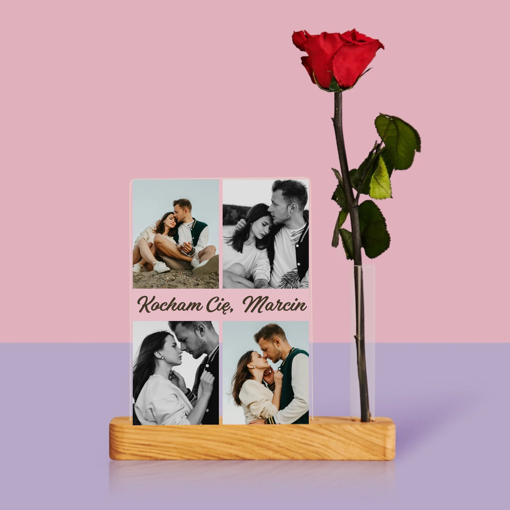 Dołączona róża w małym wazonie w kształcie probówki, umieszczonym w podstawce razem z wydrukiem na szkle akrylowym.
