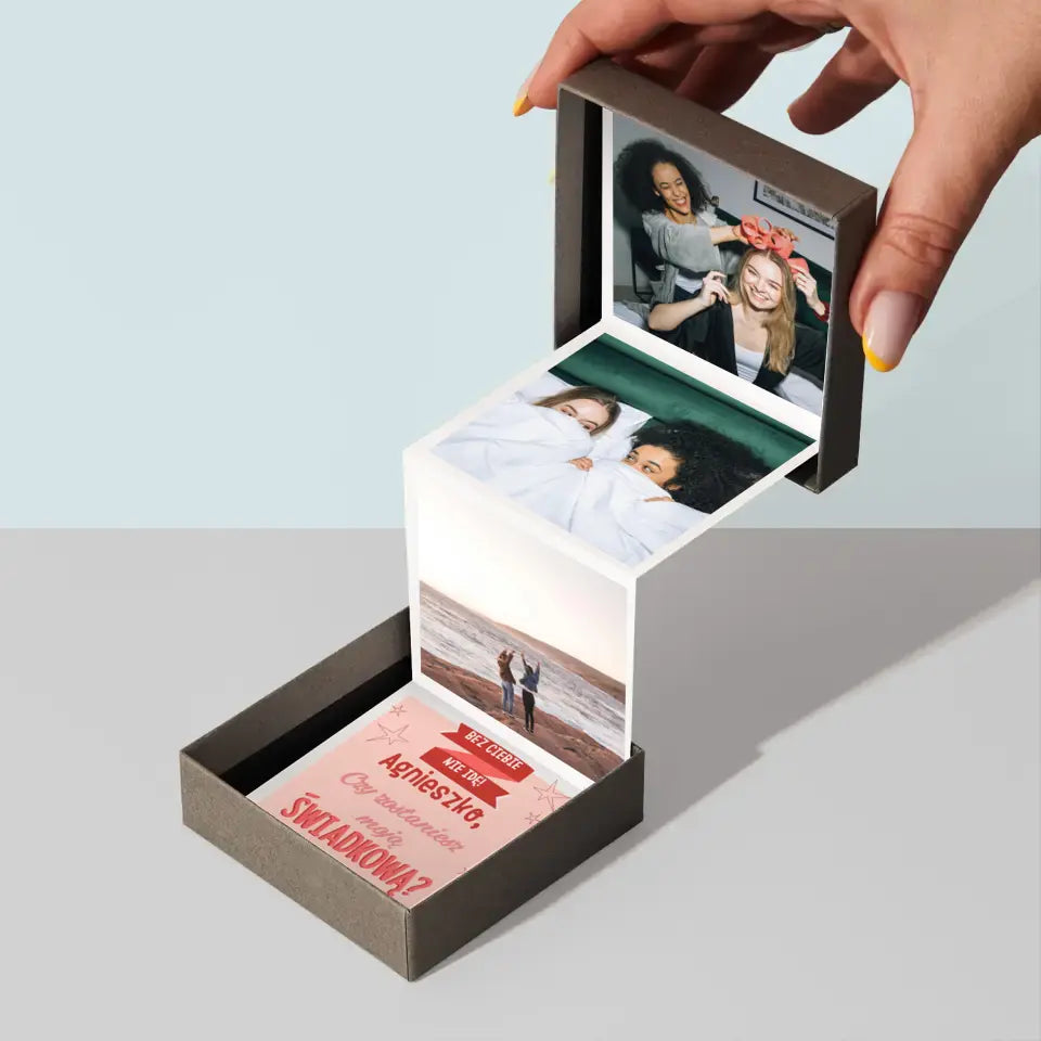 Harmonijka składa się z trzech zdjęć o wymiarach 6,68 x 6,68 cm oraz z personalizowanej karteczki z dedykacją dla obdarowanej osoby