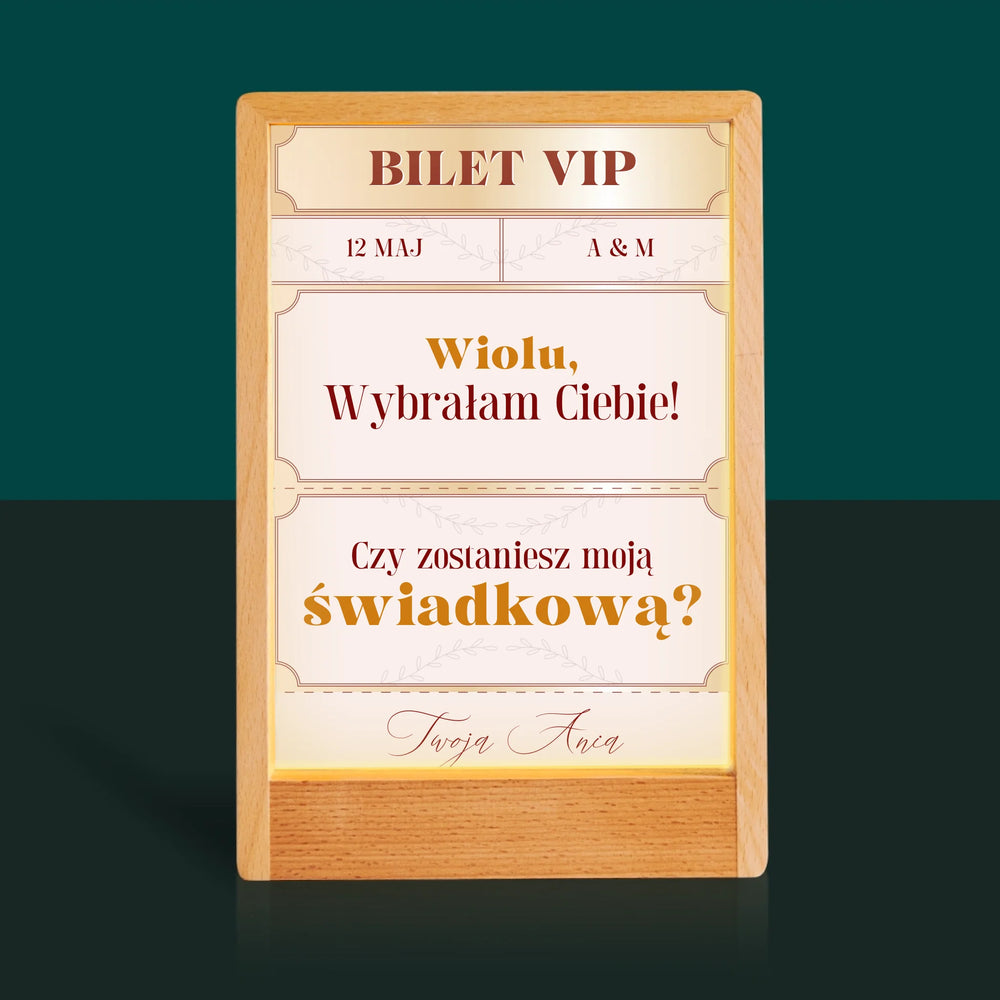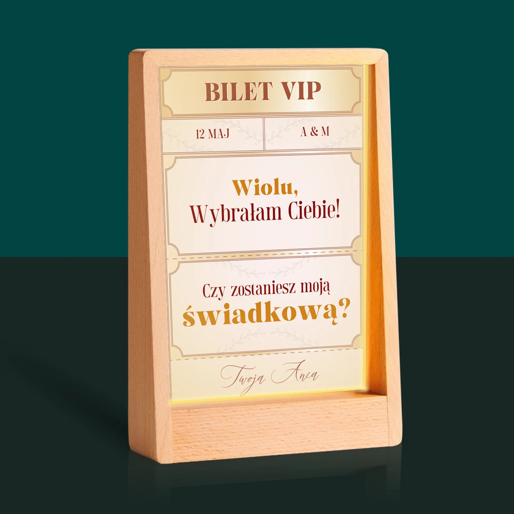 Imię i Podpis: Bilety Vip Świadkowa - Wydruk na szkle akrylowym w ramce LED