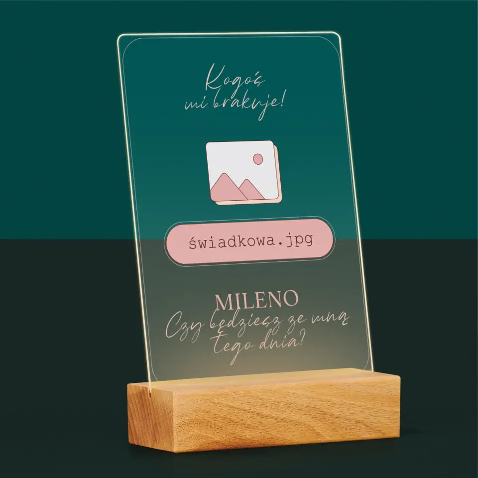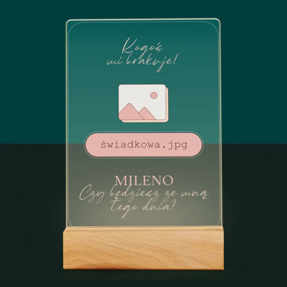 Imię i Podpis: Kogoś Mi Brakuje Świadkowa - Wydruk na szkle akrylowym w ramce LED