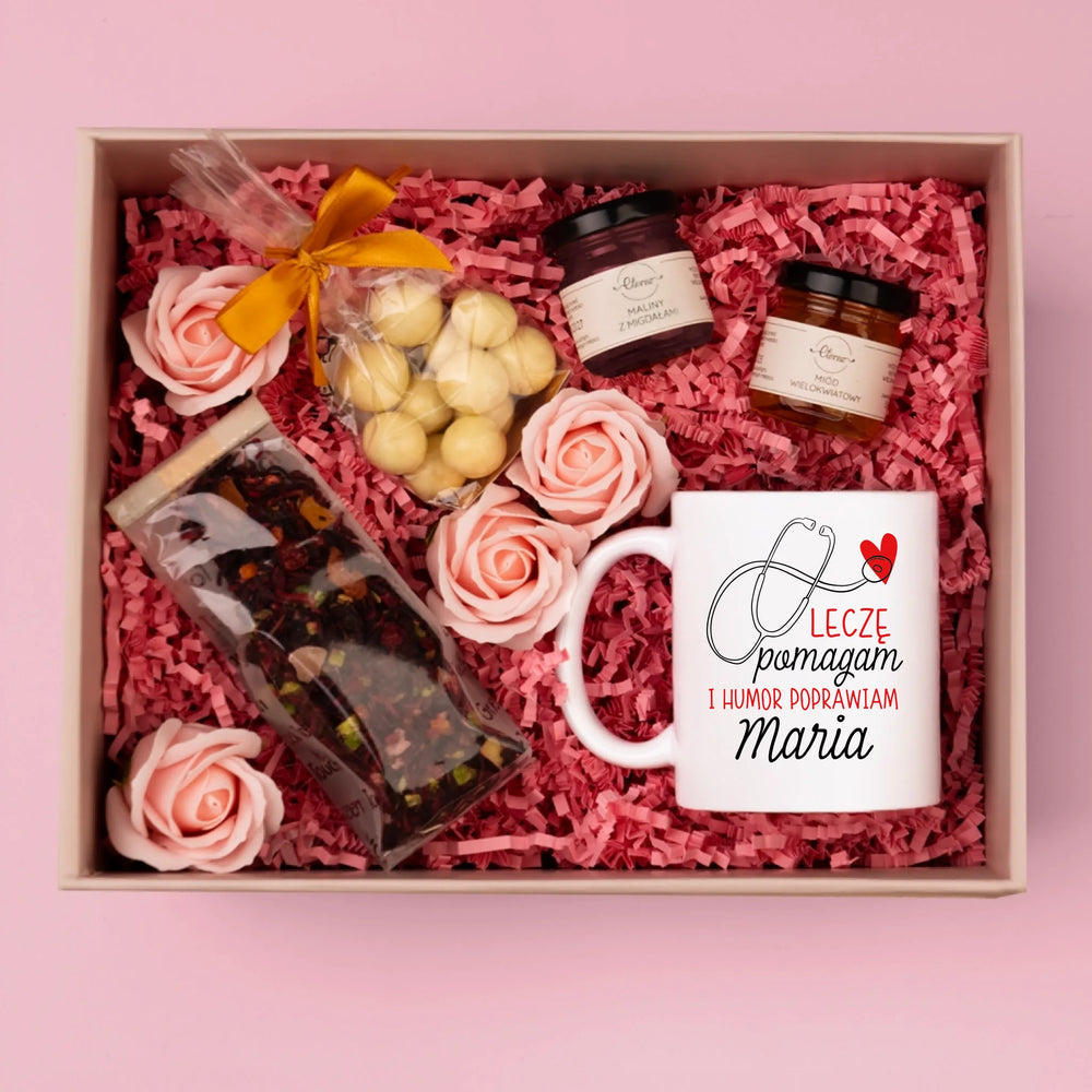 Imię i Podpis: Leczę Pomagam - Zestaw prezentowy z kubkiem, herbatą i słodkościami