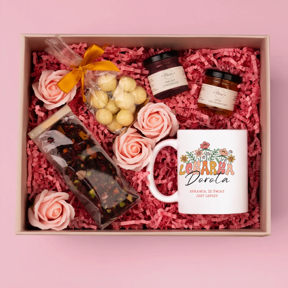 Imię i Podpis: Lekarka - Zestaw prezentowy z kubkiem, herbatą i słodkościami