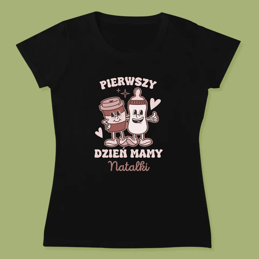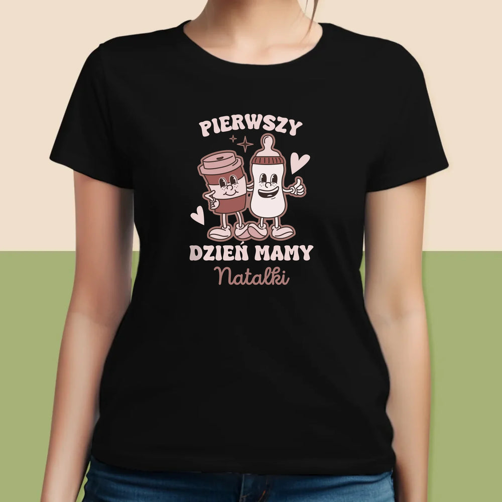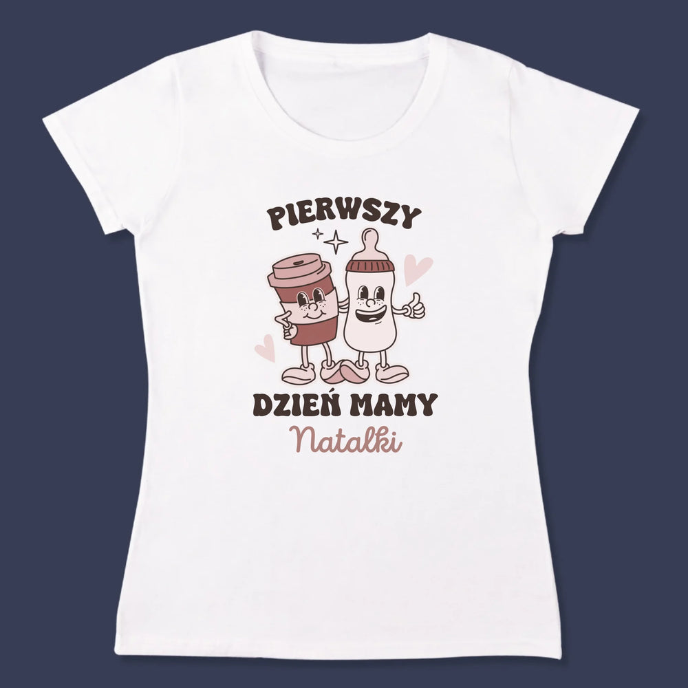Imię i Podpis: Pierwszy Dzień Mamy Kawa Mleko - Personalizowana Koszulka Damska
