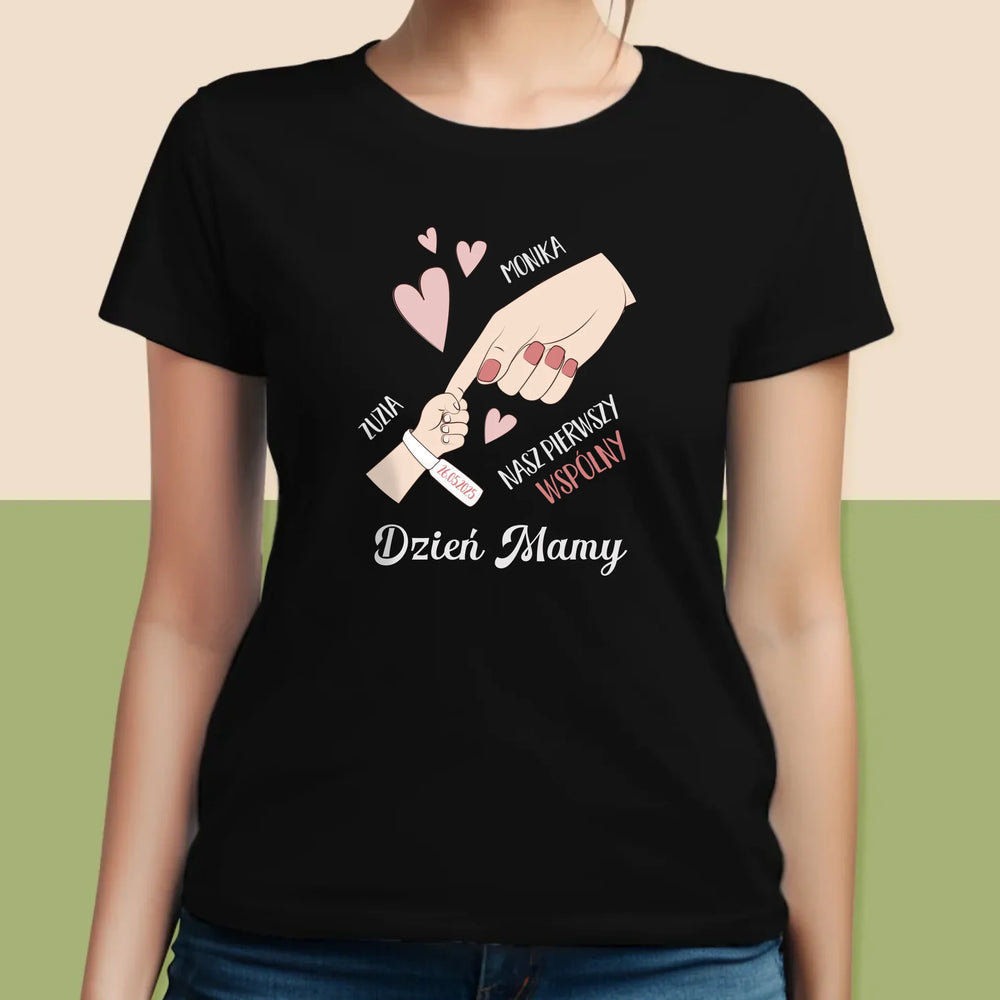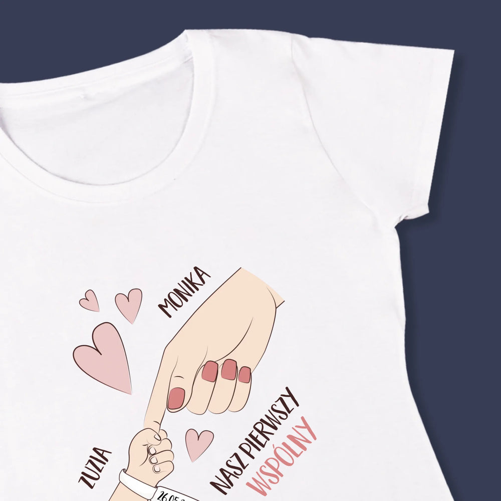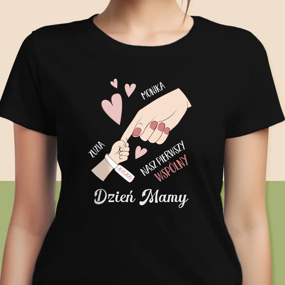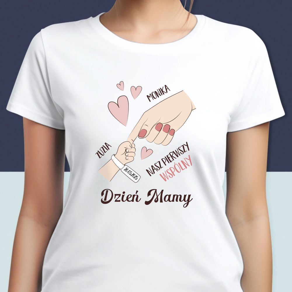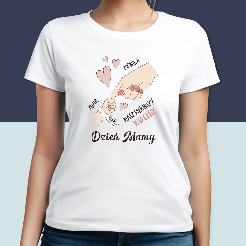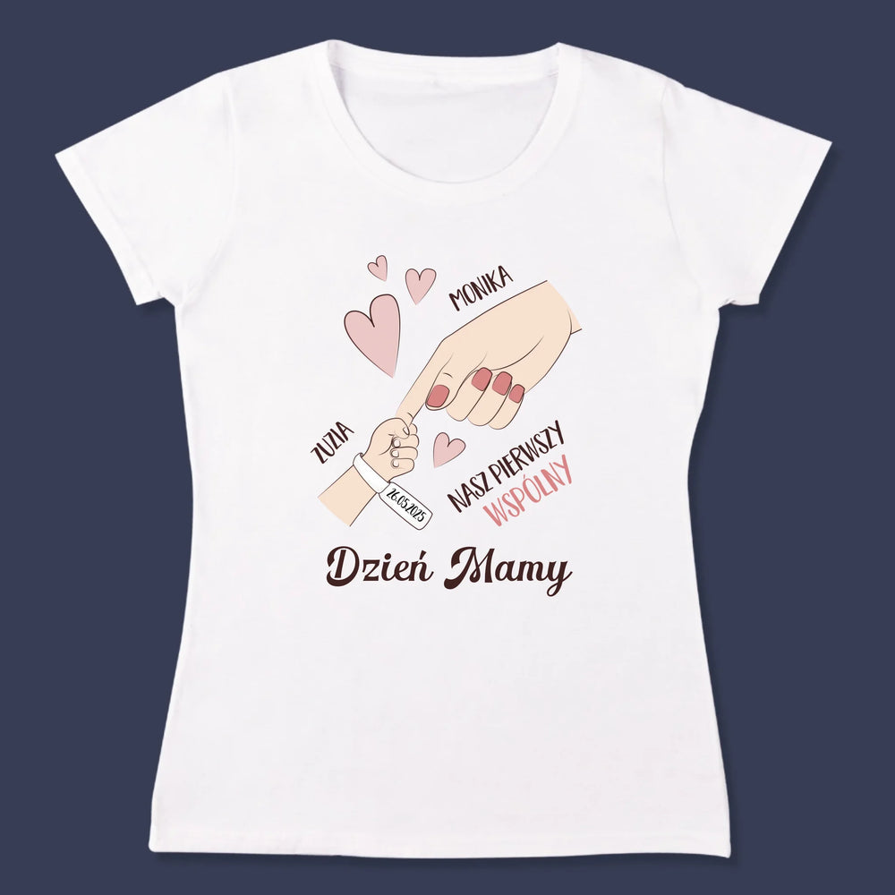 Imię i Podpis: Pierwszy Wspólny Dzień Mamy - Personalizowana Koszulka Damska