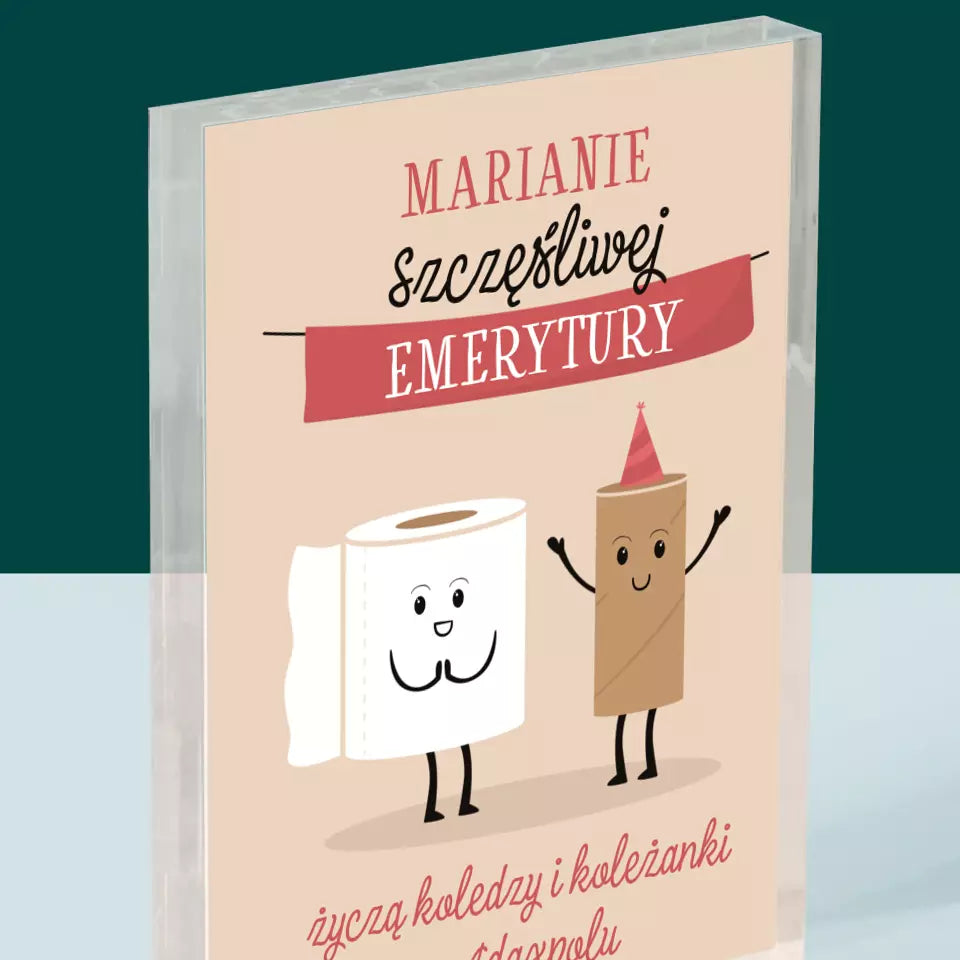 Imię i Podpis: Szczęśliwej Emerytury - Blok Akrylowy z Nadrukiem