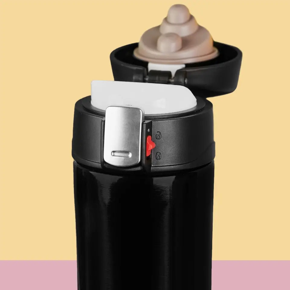 Posiada wygodny ustnik oraz szczelne zamknięcie, chroniące przed rozlaniem napoju. Dodatkowo blokada zabezpiecza kubek przed przypadkowym otwarciem.