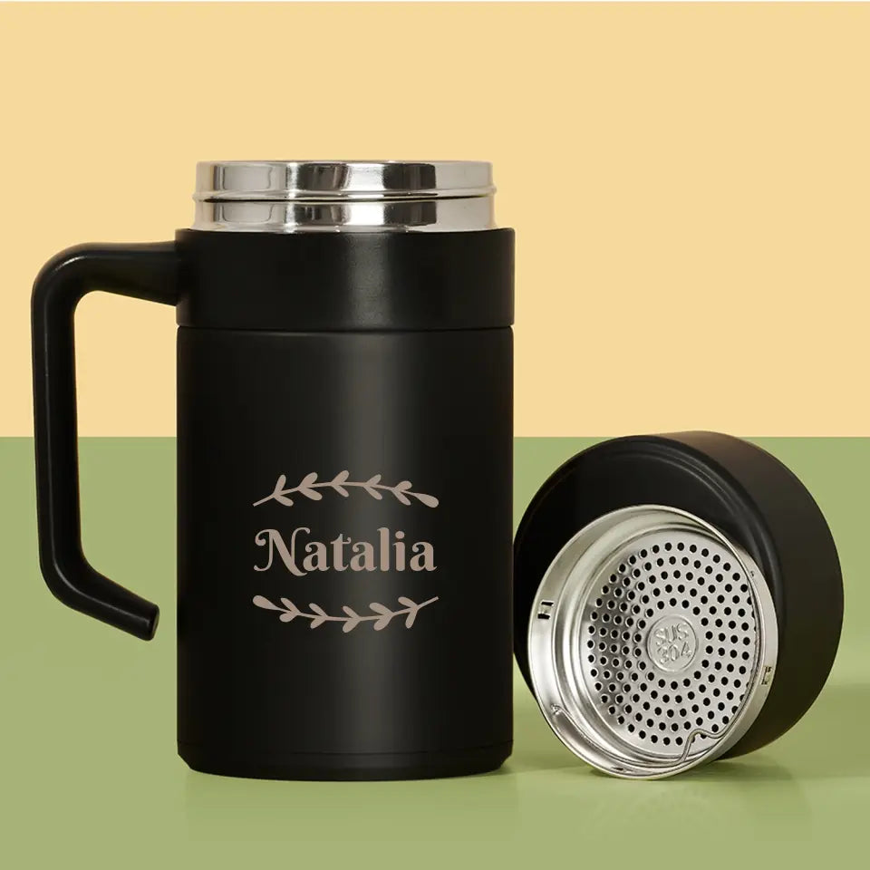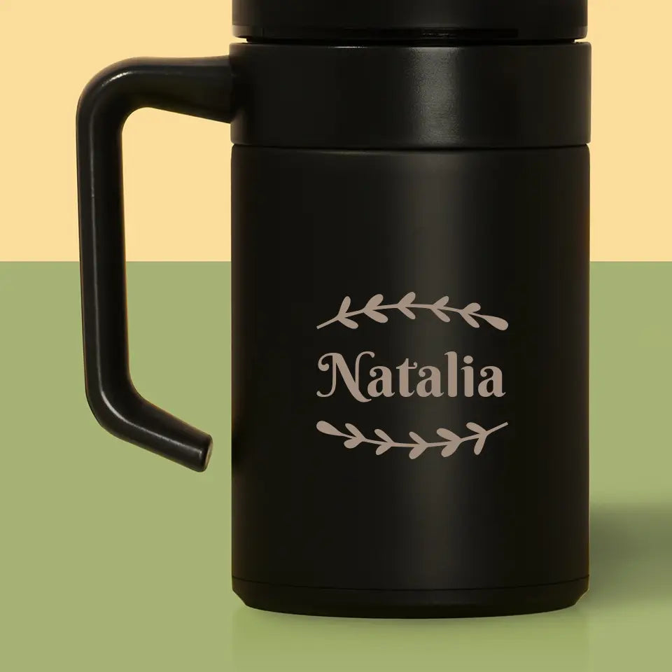 Wysokiej jakości kubek termiczny z wybraną przez Ciebie personalizacją w postaci monogramu.