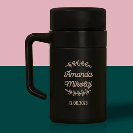 Wysokiej jakości kubek termiczny z wybraną przez Ciebie personalizacją w postaci monogramu.