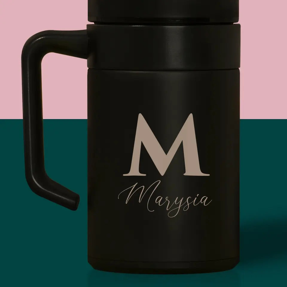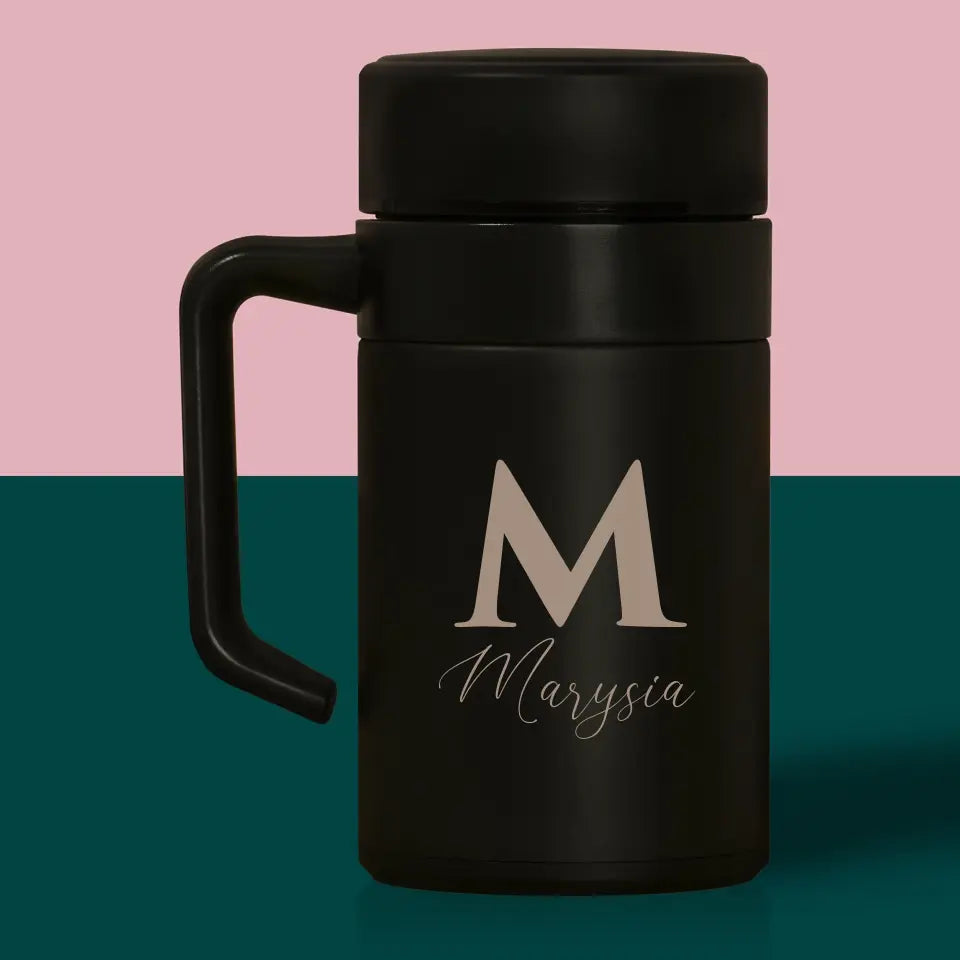 Wysokiej jakości kubek termiczny z wybraną przez Ciebie personalizacją w postaci monogramu.