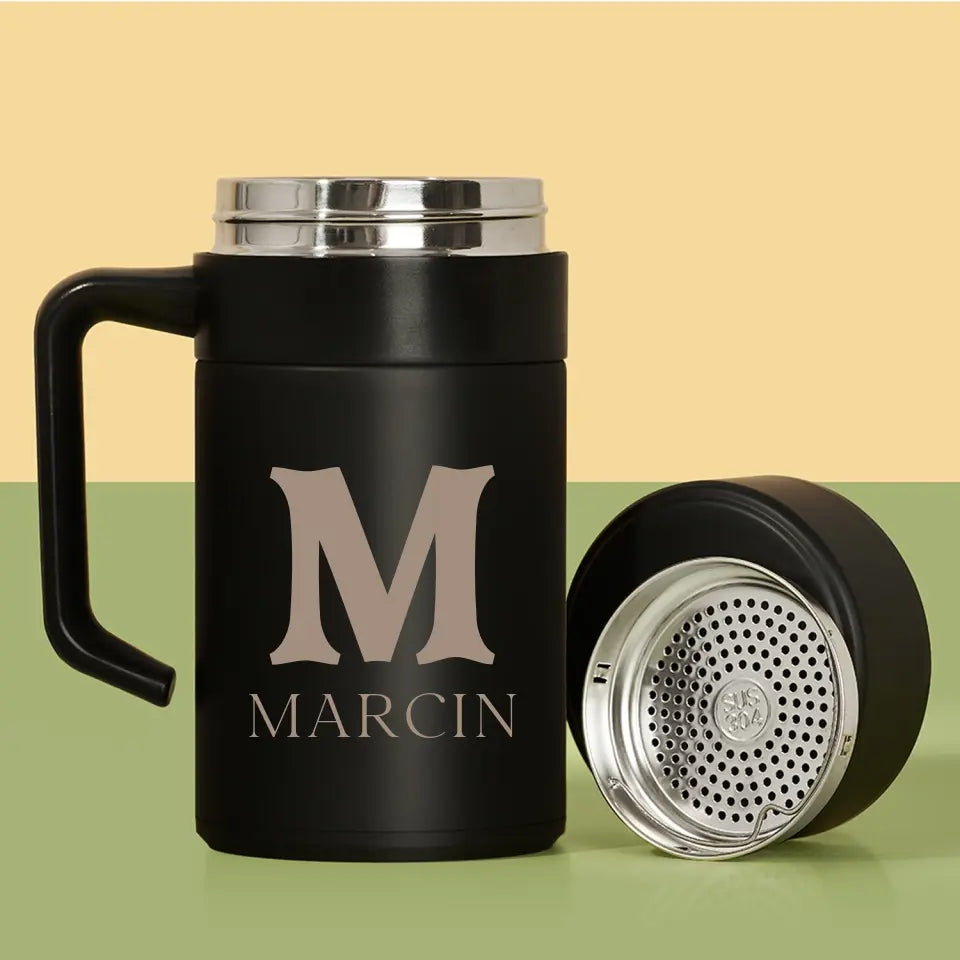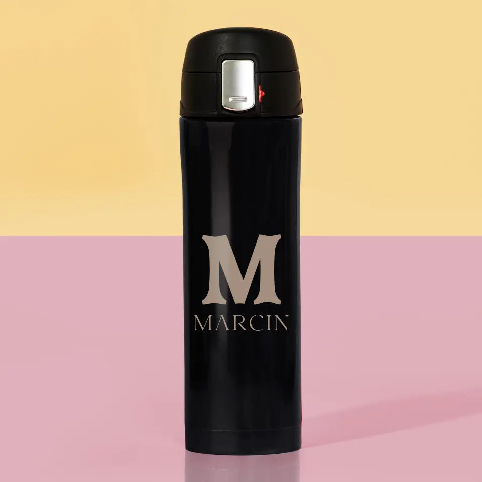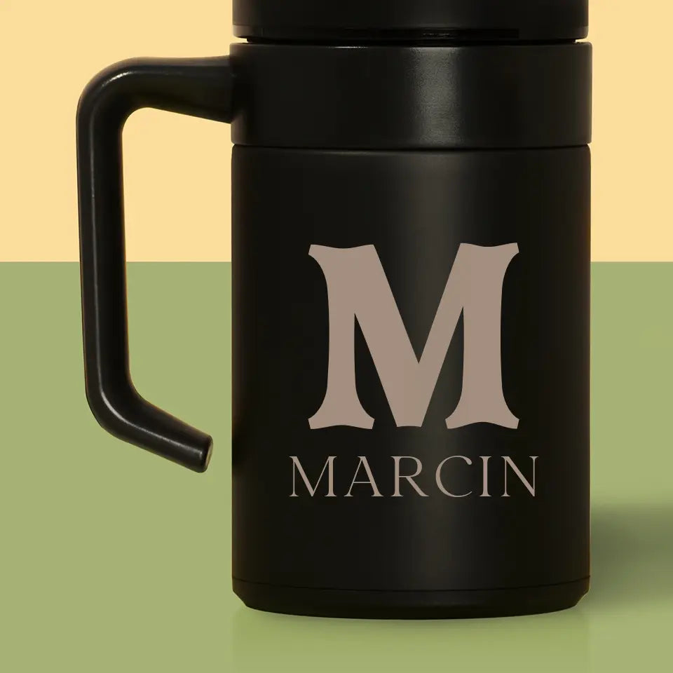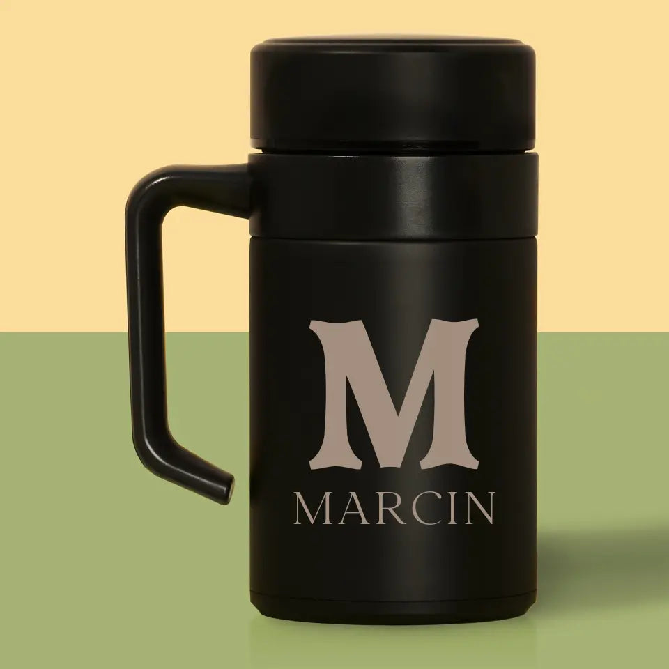 Wysokiej jakości kubek termiczny z wybraną przez Ciebie personalizacją w postaci monogramu.