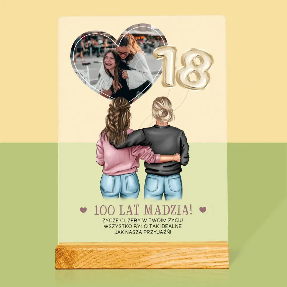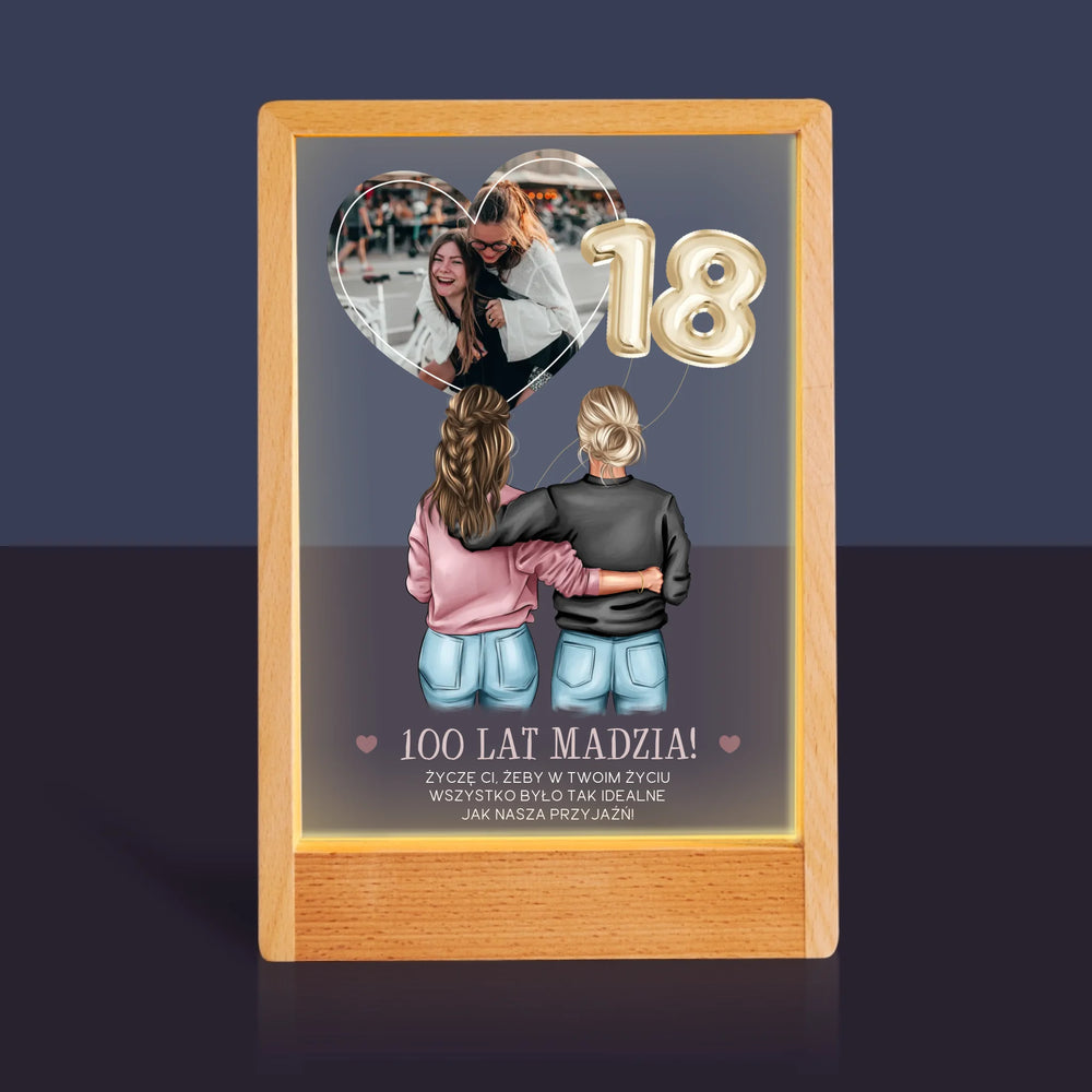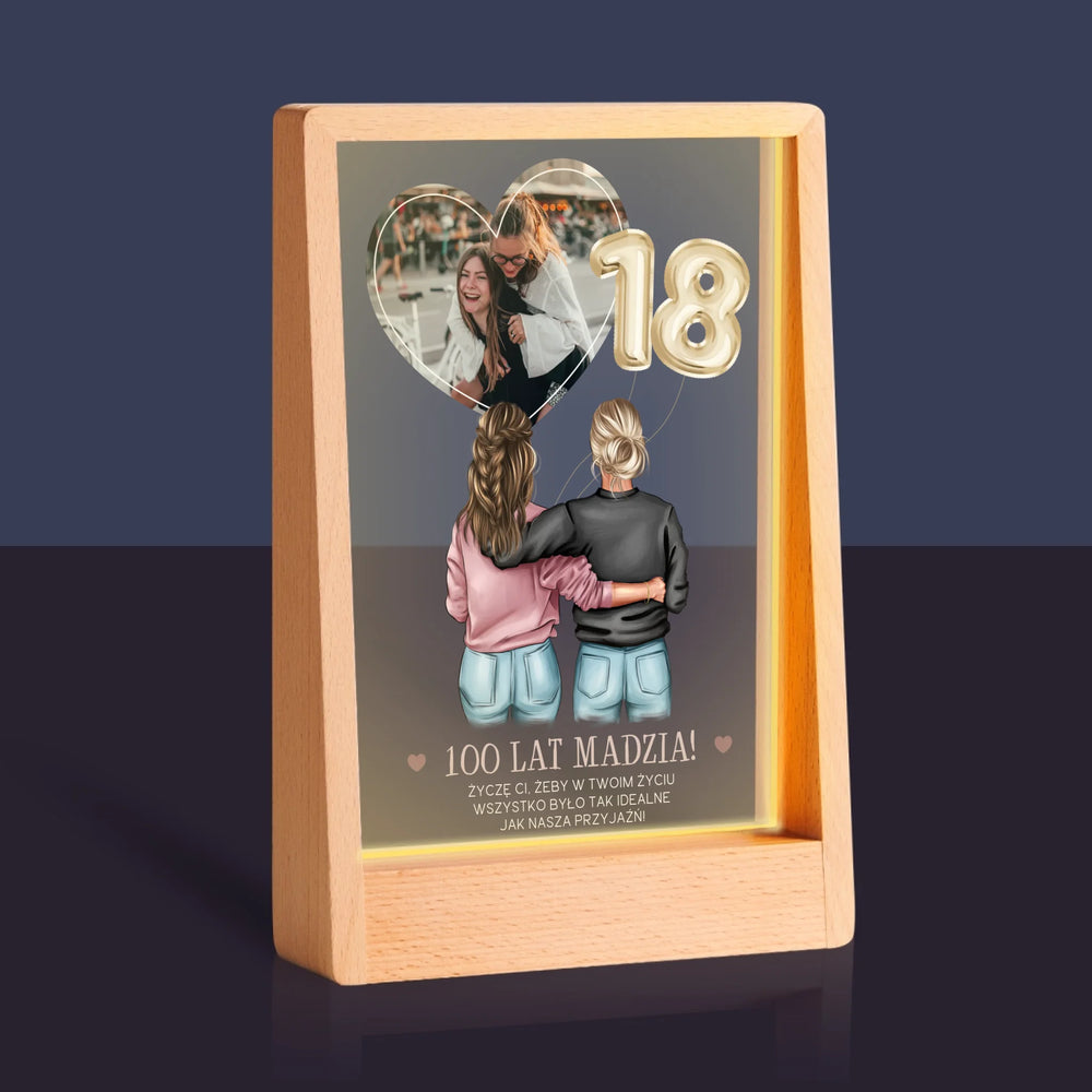 Kreator Postaci: 18 Urodziny Przyjaciółki - Wydruk na szkle akrylowym w ramce LED
