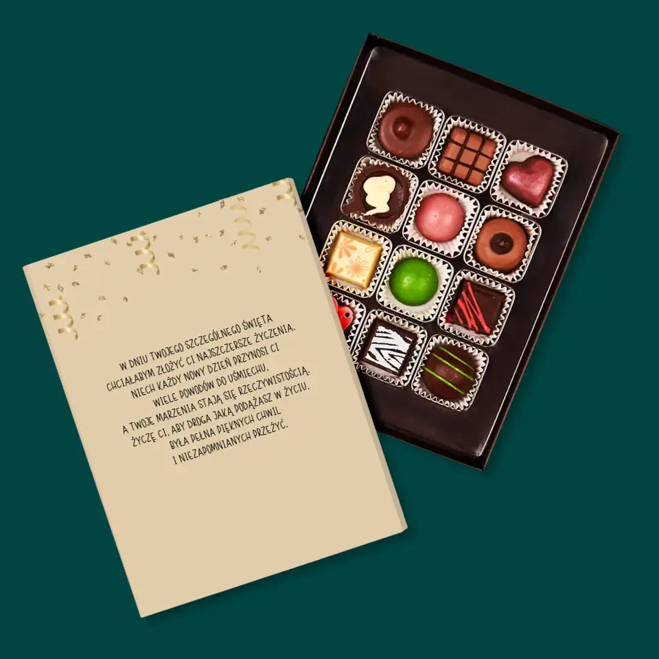 Pyszne praliny z belgijskiej czekolady w eleganckim pudełku z wybraną przez Ciebie personalizacją.