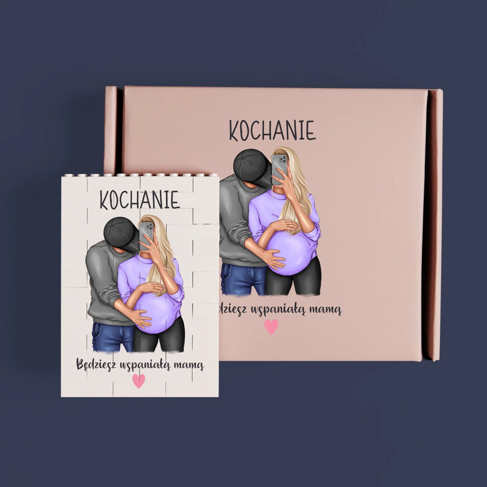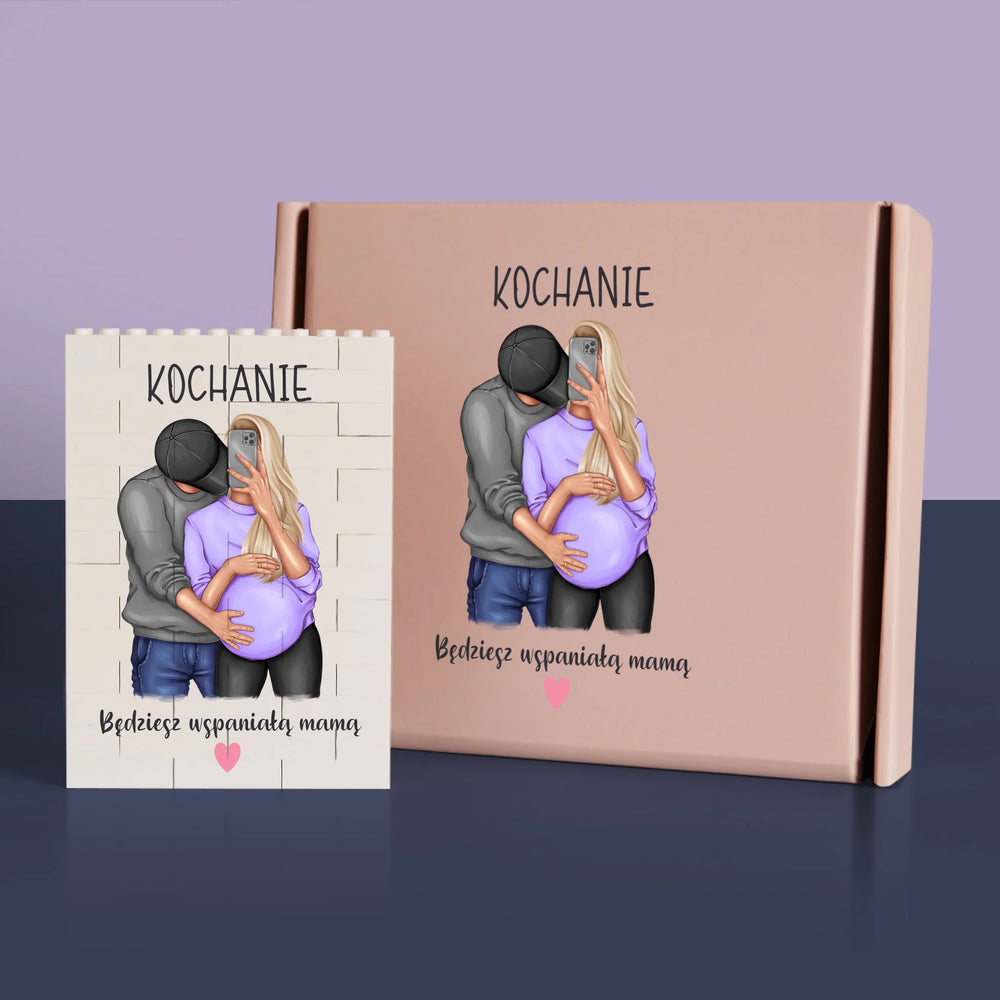 Personalizowany nadruk na klockach oraz na beżowym pudełku.