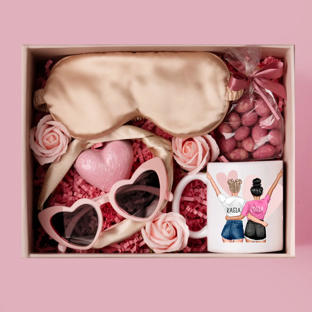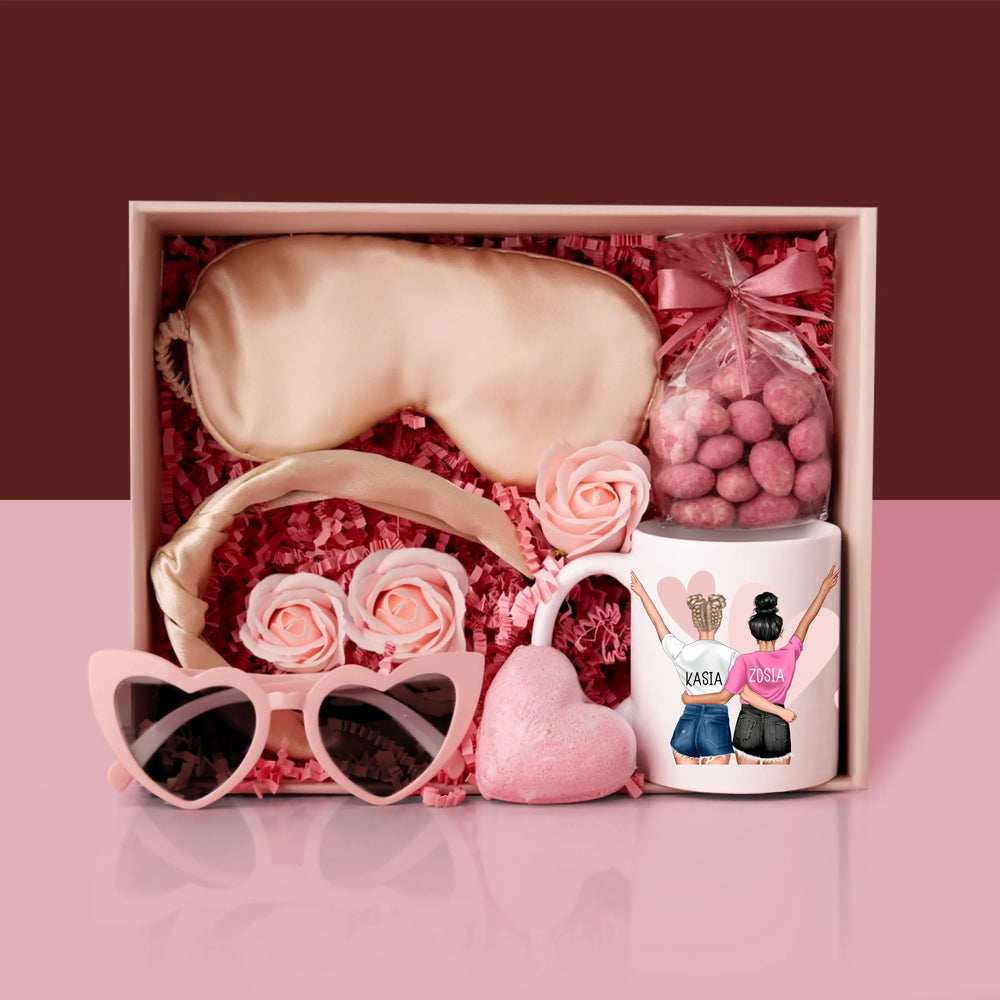W zestawie znajdują się migdały w czekoladzie, kula do kąpieli w kształcie serca, opaska na oczy, okulary w kształcie serca oraz róże mydlane.