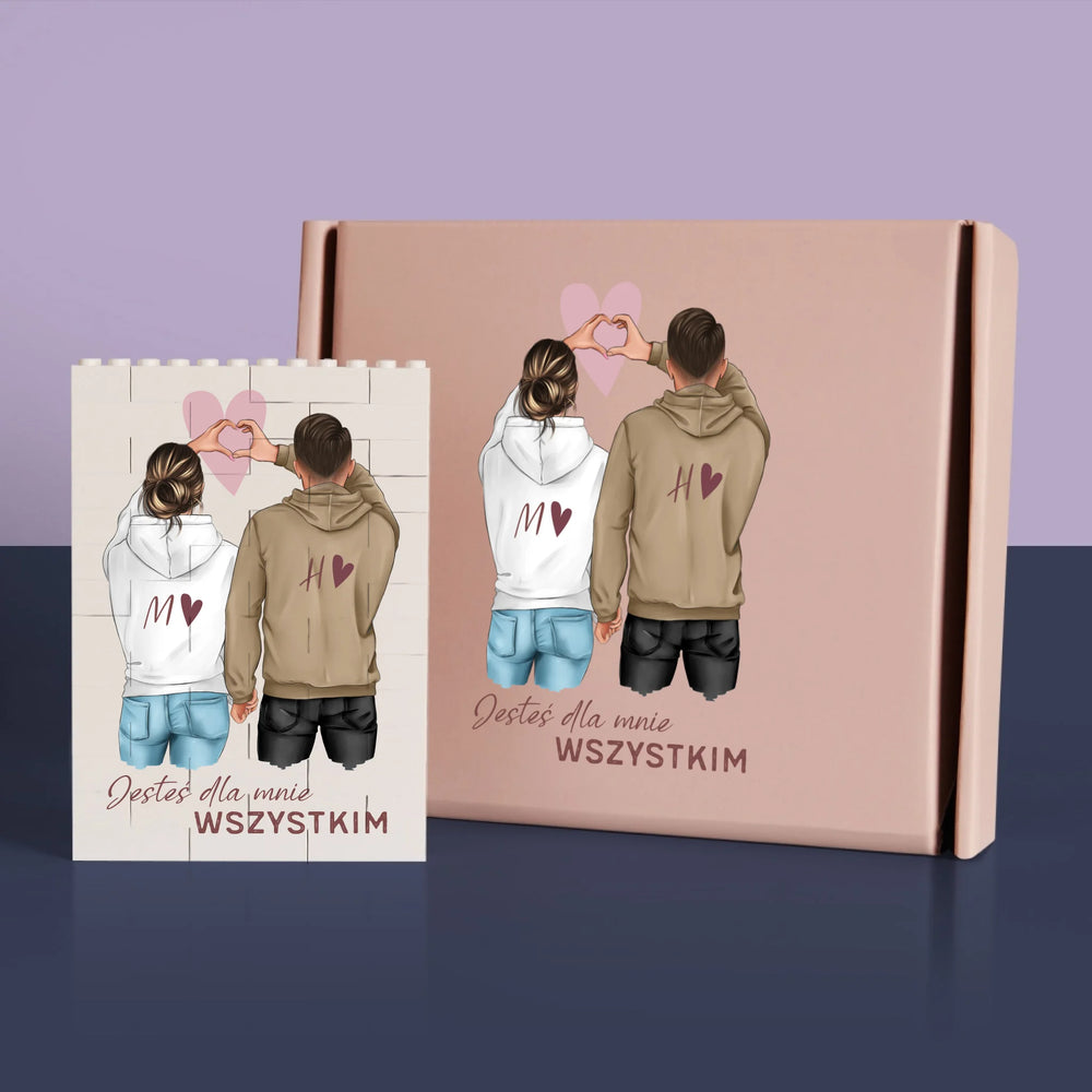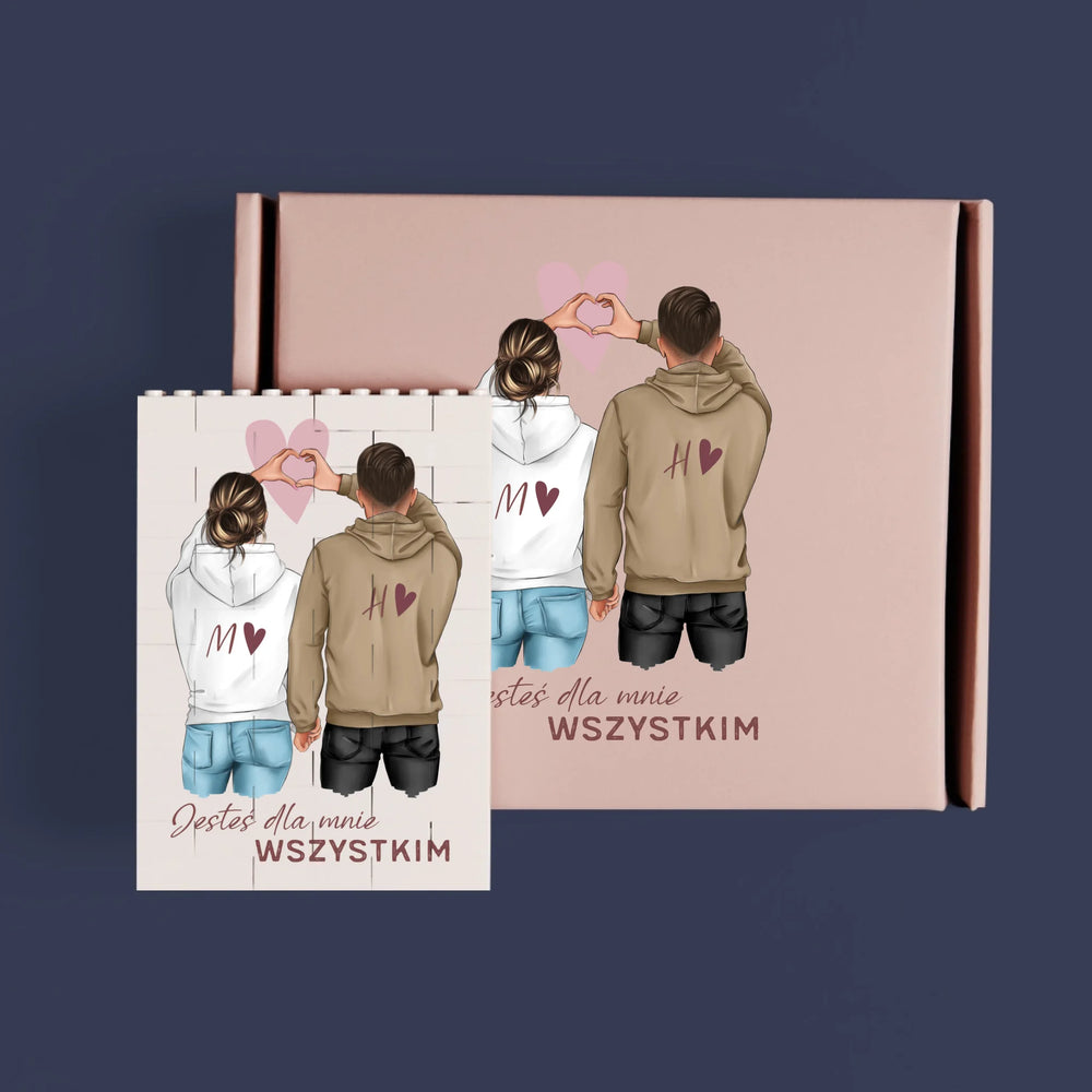 Personalizowany nadruk na klockach oraz na beżowym pudełku.