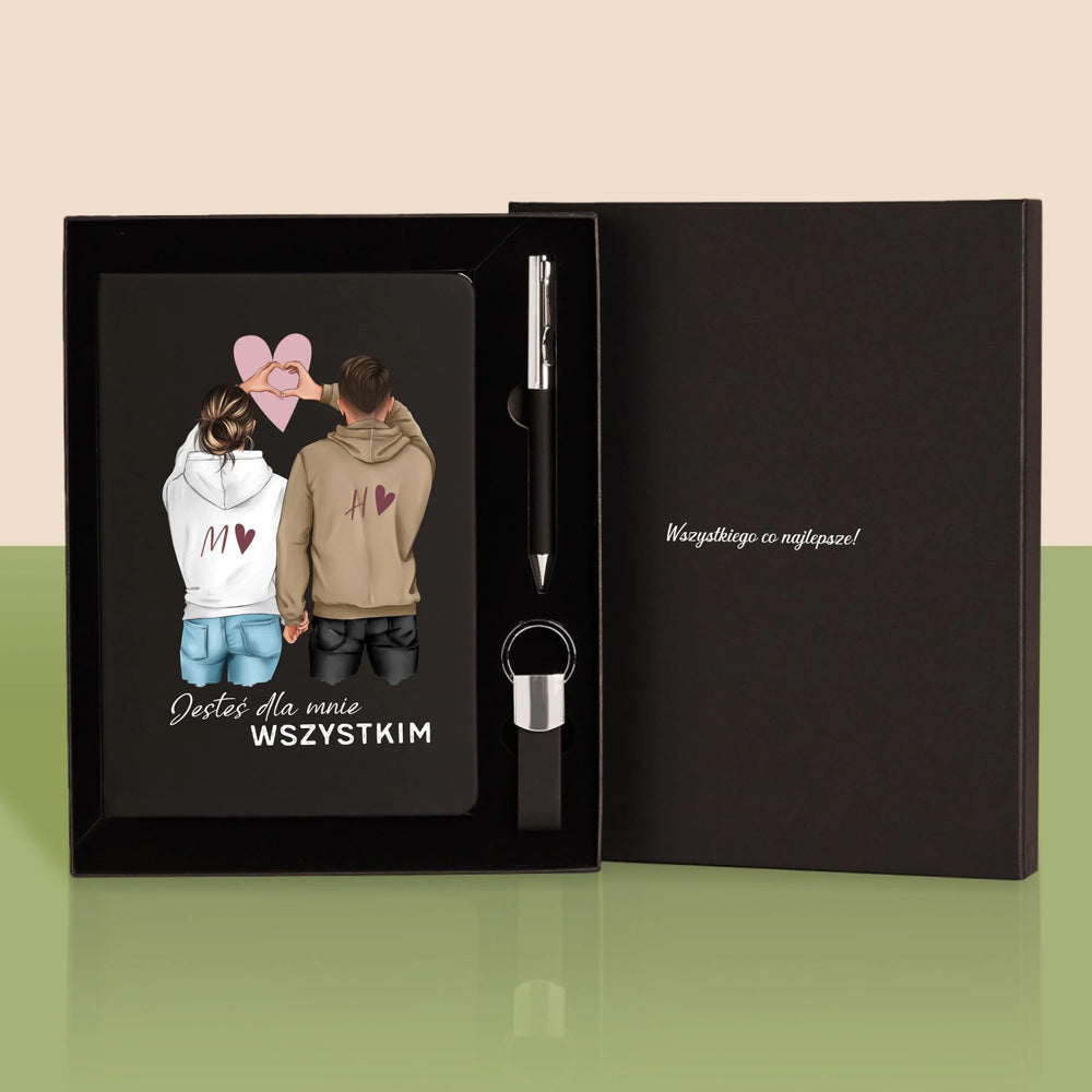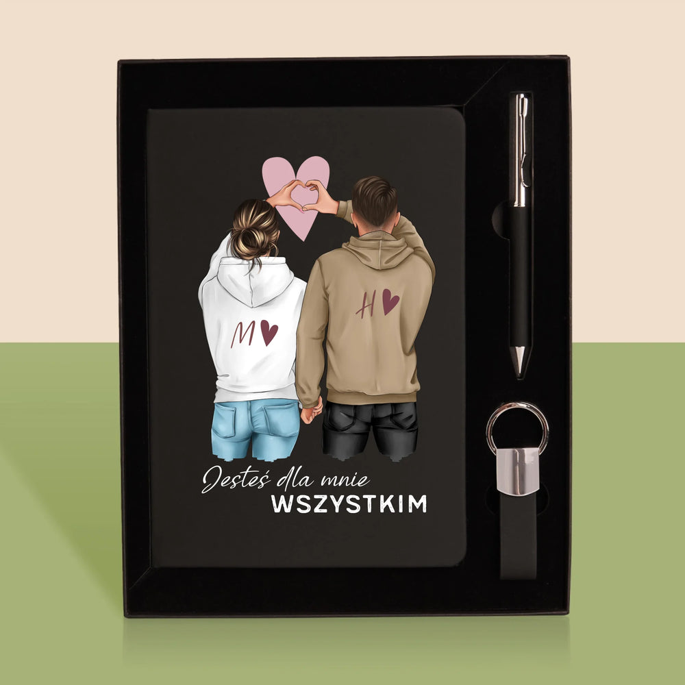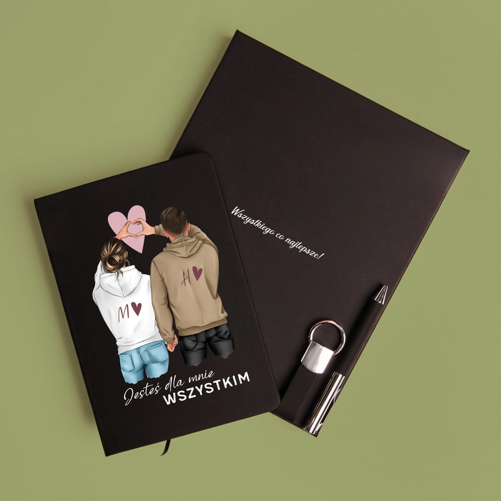 Zestaw z eleganckim notatnikiem z wybraną przez Ciebie personalizacją na okładce.