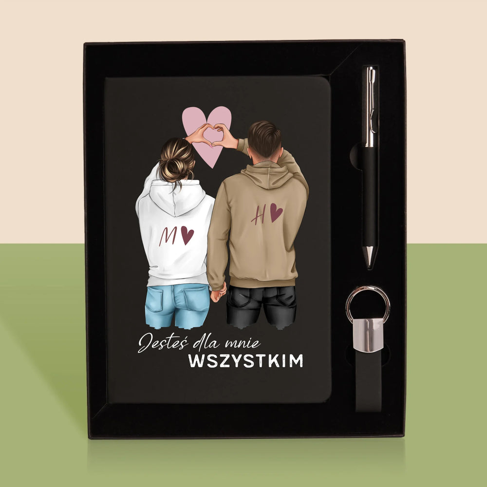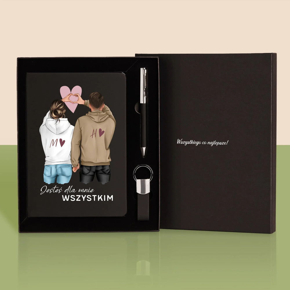 • Zestaw z eleganckim notatnikiem z wybraną przez Ciebie personalizacją na okładce.