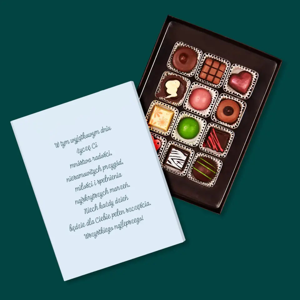 Pyszne praliny z belgijskiej czekolady w eleganckim pudełku z wybraną przez Ciebie personalizacją.
