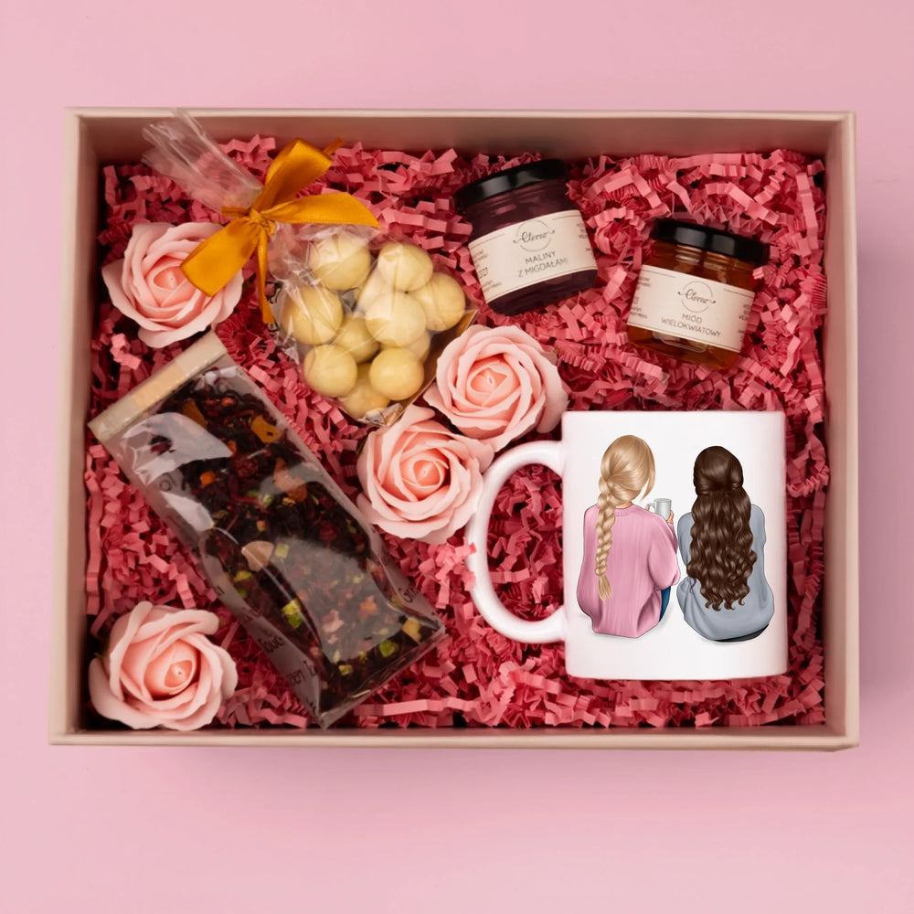 Kreator Postaci: Przyjaciółki - Zestaw prezentowy z kubkiem, herbatą i słodkościami
