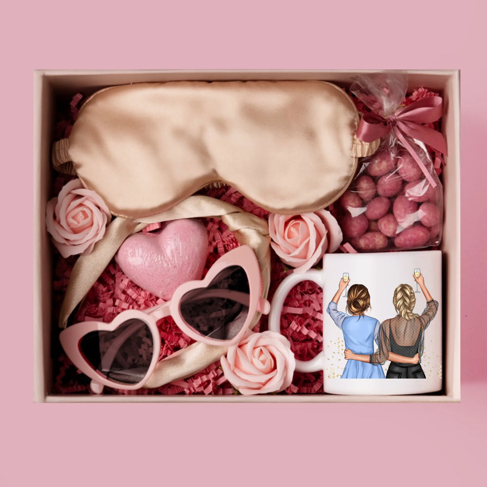 W zestawie znajdują się migdały w czekoladzie, kula do kąpieli w kształcie serca, opaska na oczy, okulary w kształcie serca oraz róże mydlane.