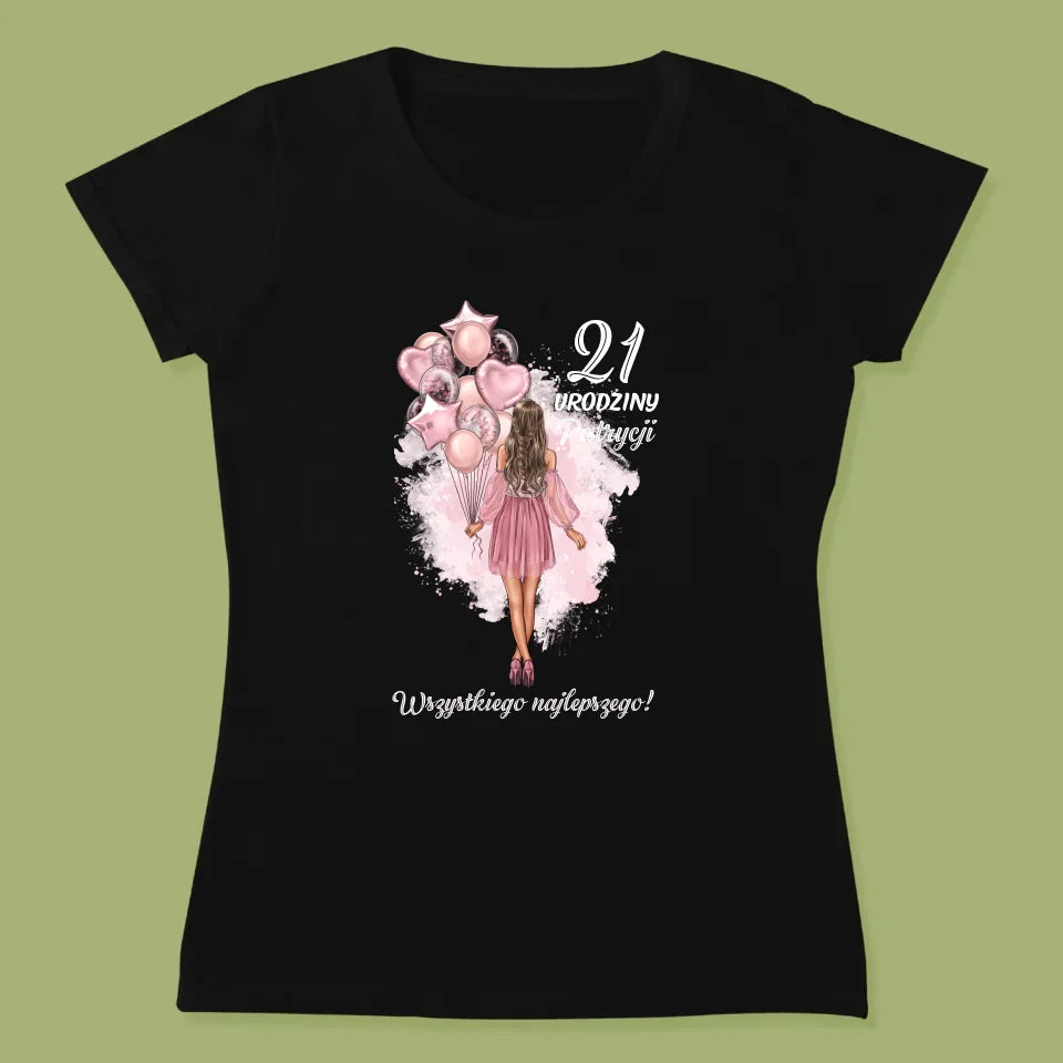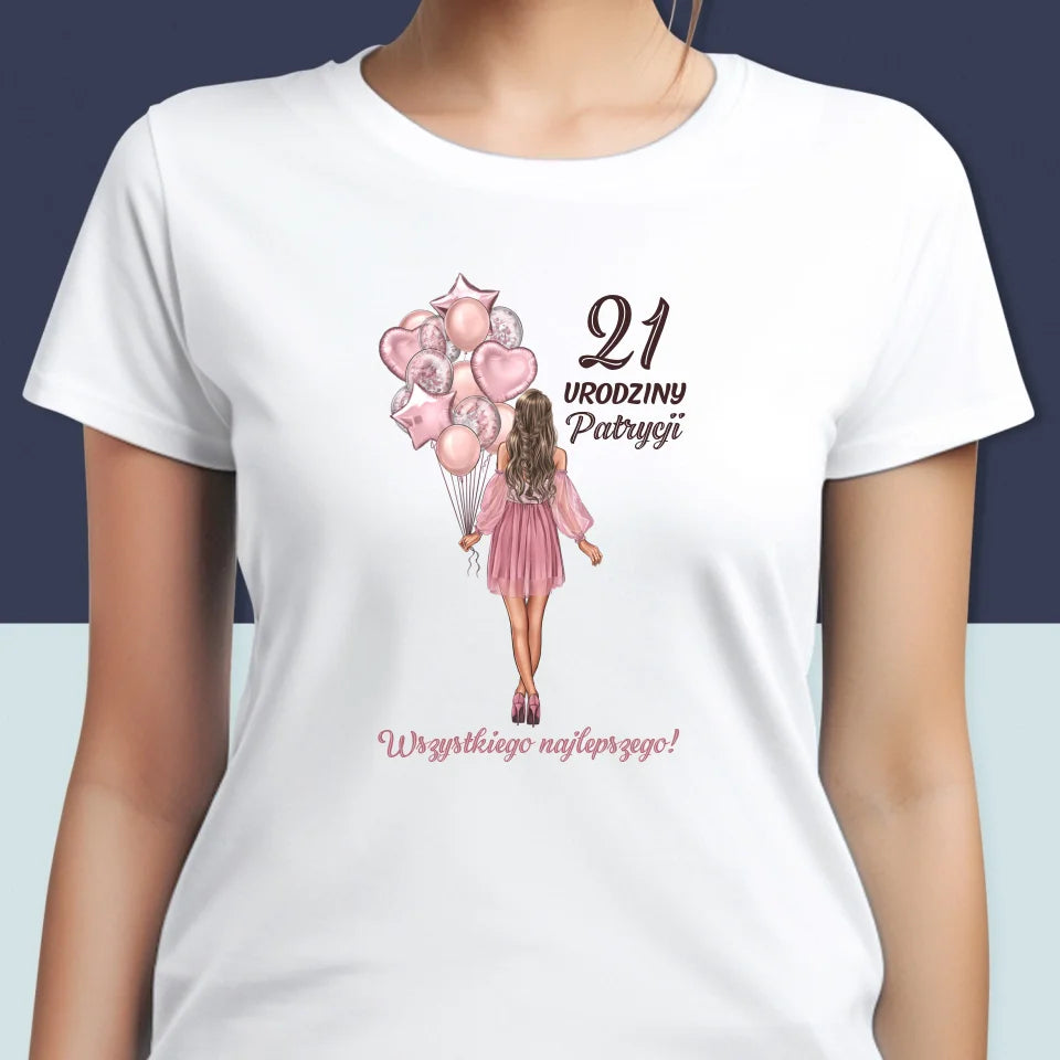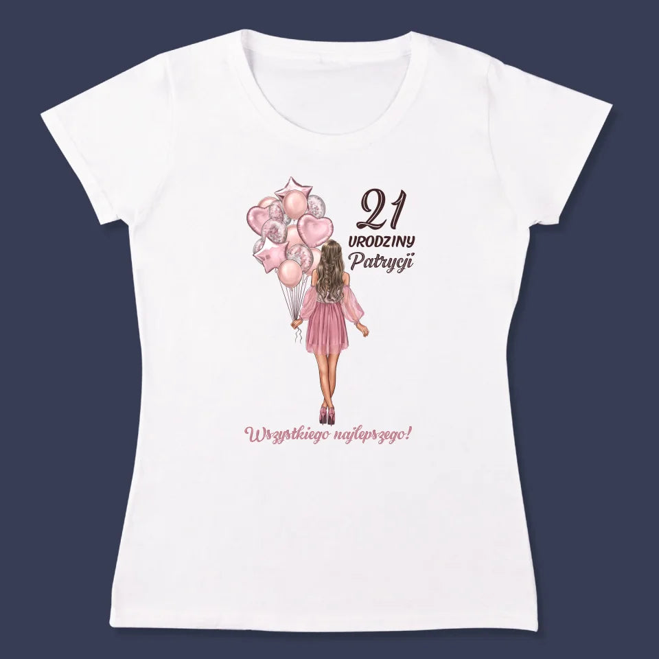 Kreator Postaci: Urodziny Balony - Personalizowana Koszulka Damska