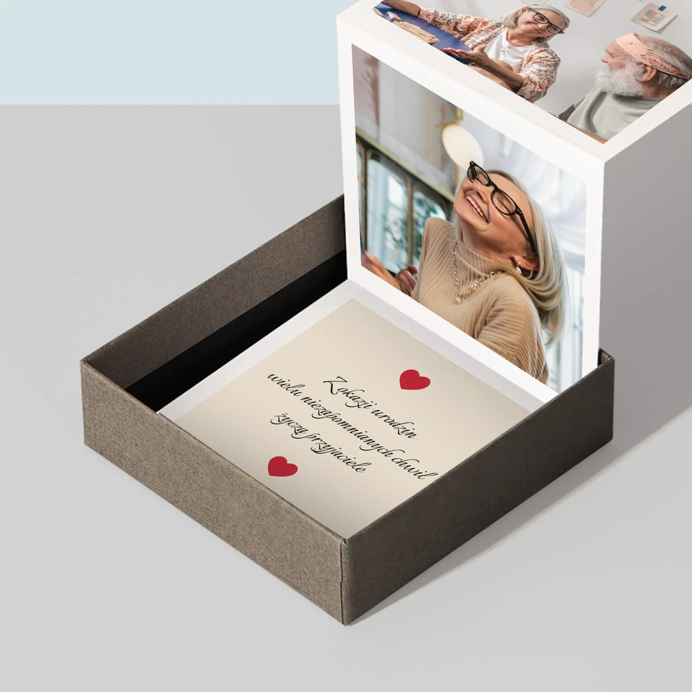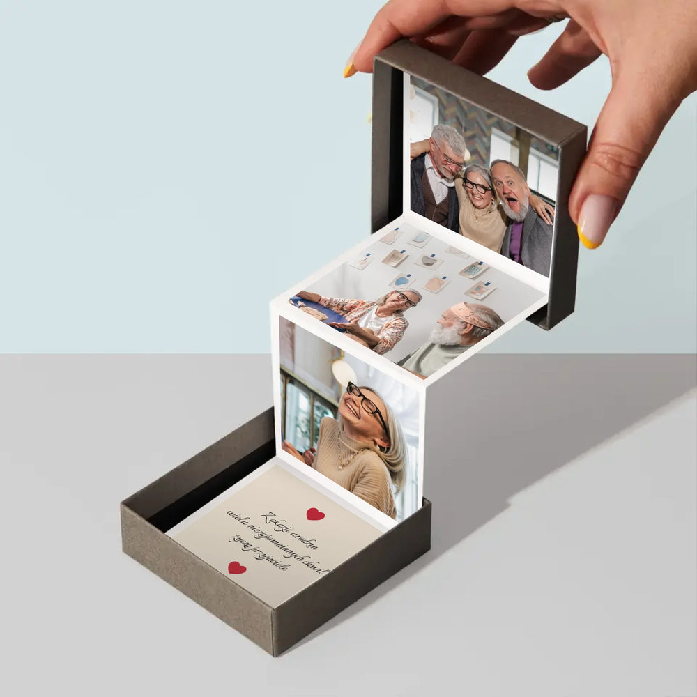 Harmonijka składa się z trzech zdjęć o wymiarach 6,68 x 6,68 cm oraz z personalizowanej karteczki z dedykacją dla obdarowanej osoby