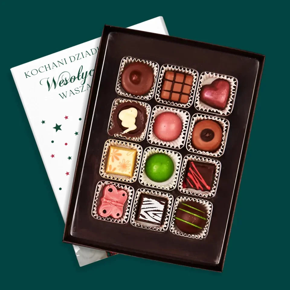 Pyszne praliny z belgijskiej czekolady w eleganckim pudełku z wybraną przez Ciebie personalizacją.