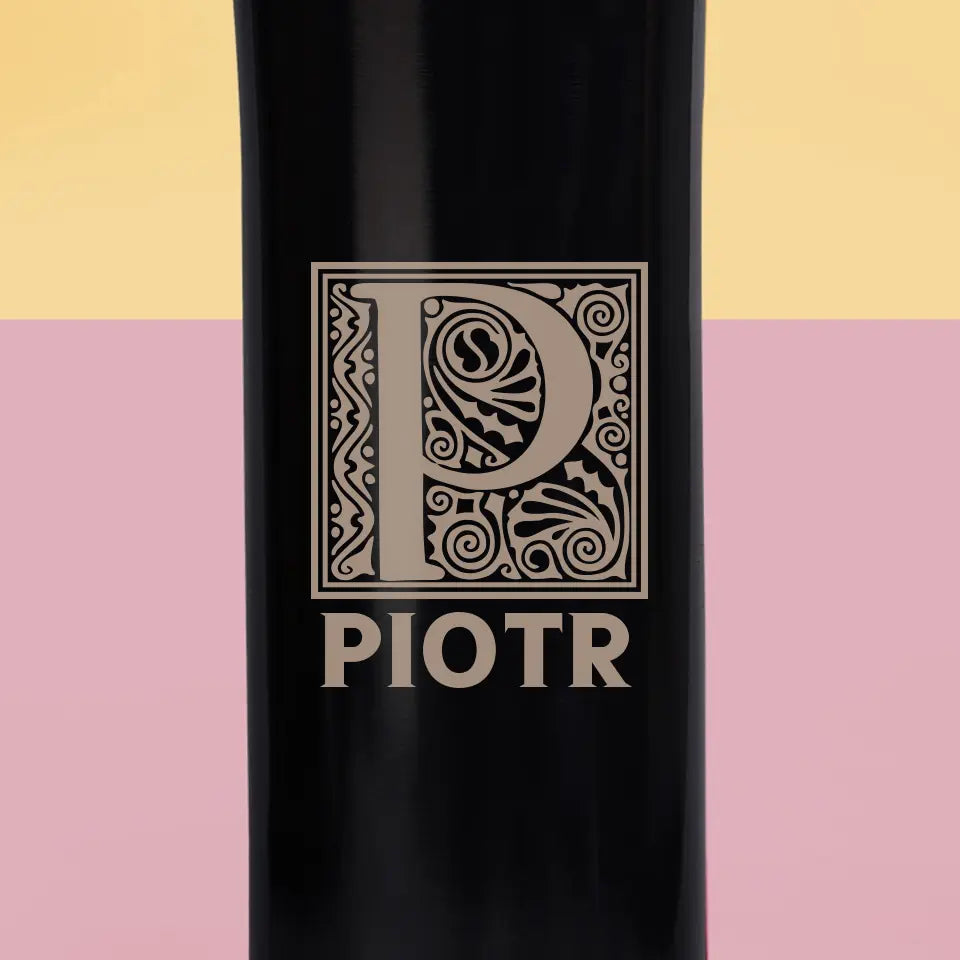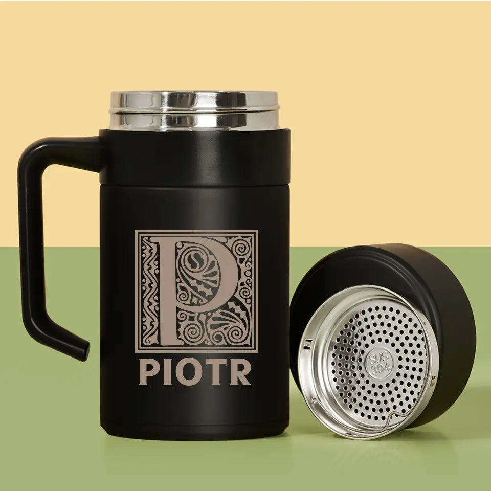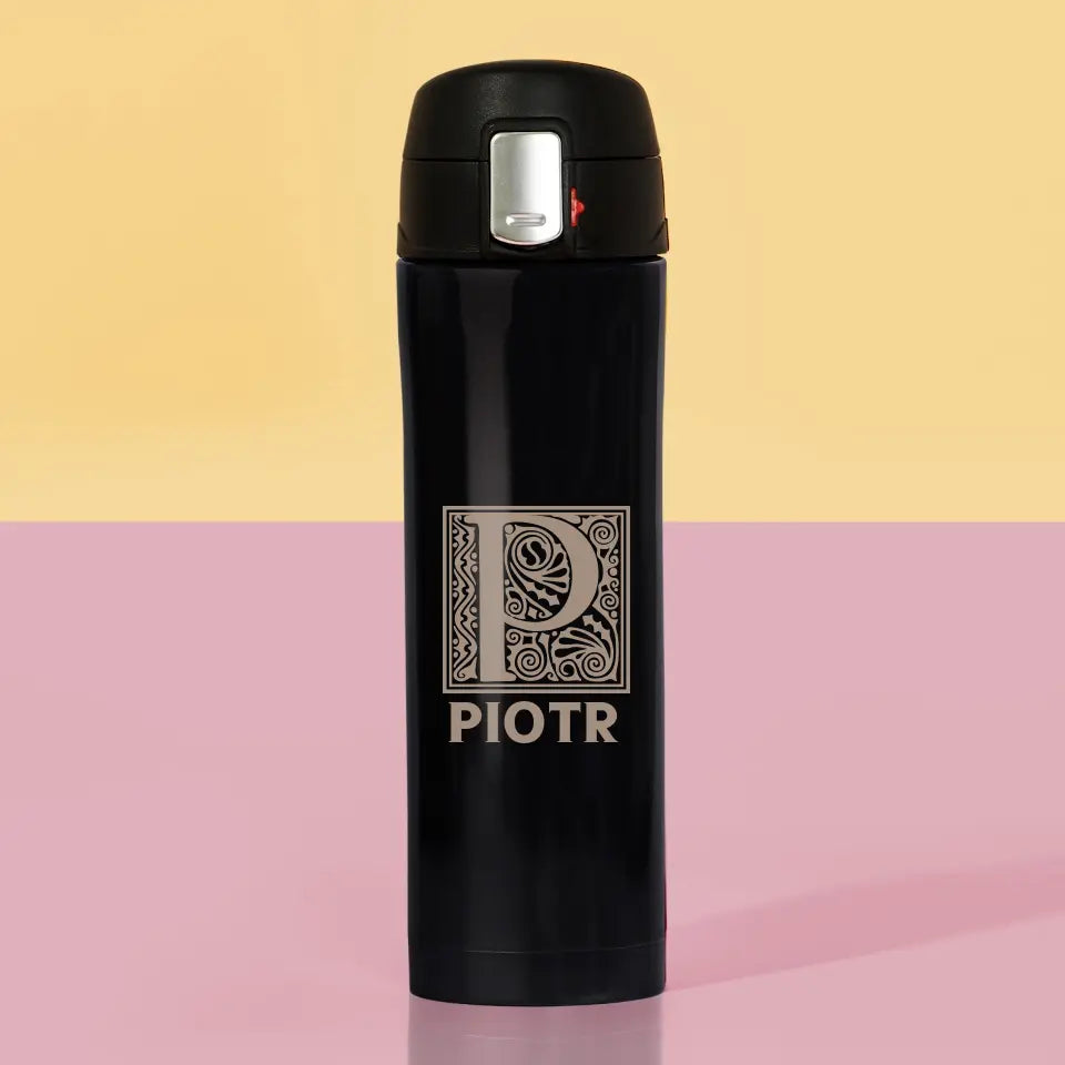 Wysokiej jakości kubek termiczny z wybraną przez Ciebie personalizacją w postaci monogramu.