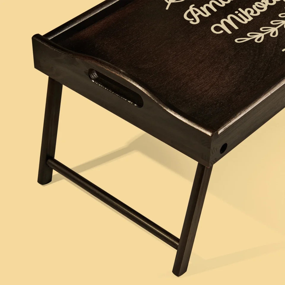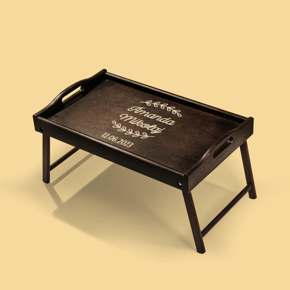 - Drewniana taca śniadaniowa w kolorze ciemnego brązu z wybraną przez Ciebie personalizacją