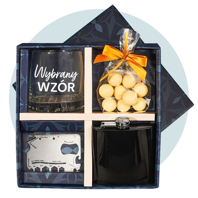 Zamień szklankę w wyjątkowy zestaw prezentowy, który zawiera: piękne pudełko, personalizowaną szklankę do whisky, kartę multitool, piersiówkę i orzechy laskowe w białej czekoladzie!