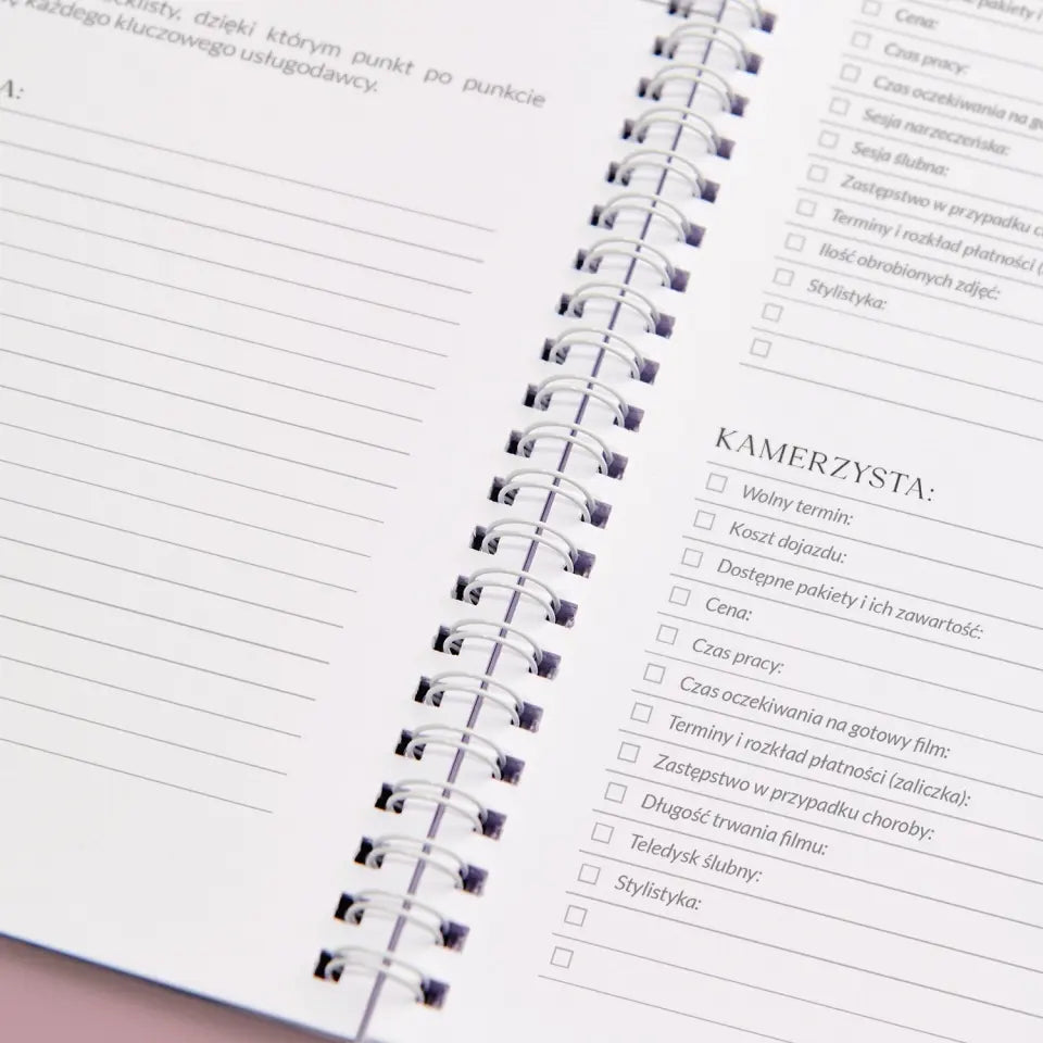W środku planera jest miejsce na listę gości, kontakty, budżet, checklisty, dodatkowe atrakcje i znacznie więcej.