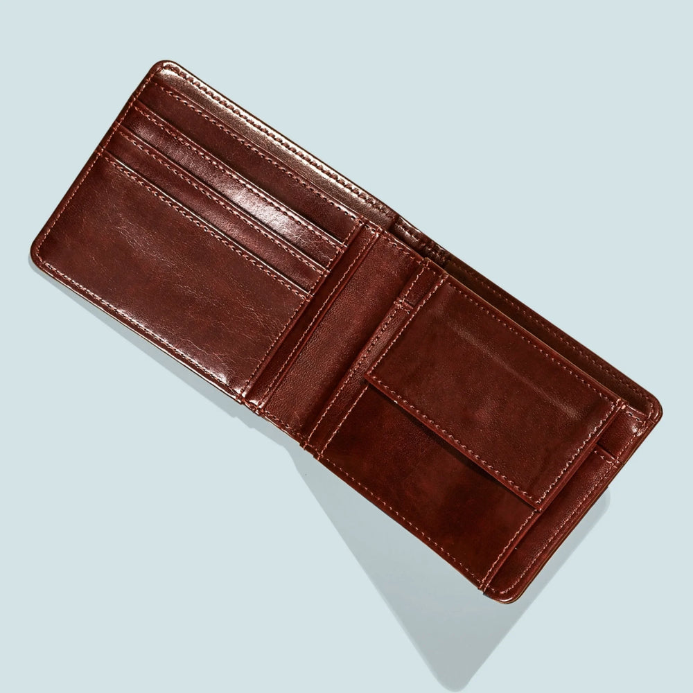 Portfel posiada 2 przegródki na banknoty, kieszonkę na monety oraz inne dodatkowe przegródki np. na karty kredytowe.