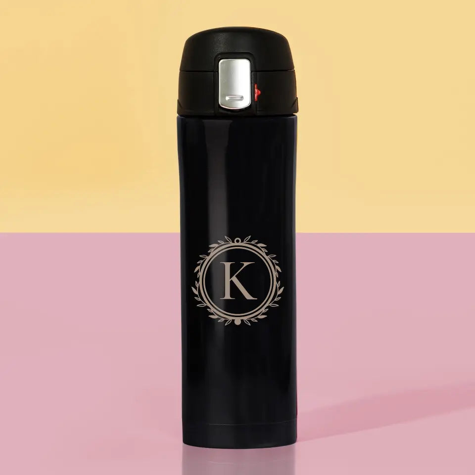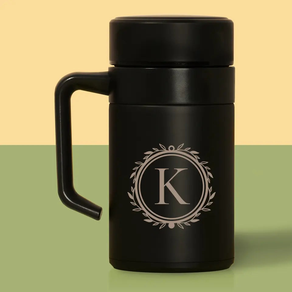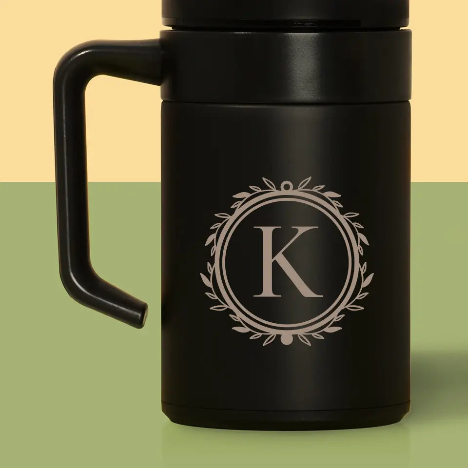 Wysokiej jakości kubek termiczny z wybraną przez Ciebie personalizacją w postaci monogramu.