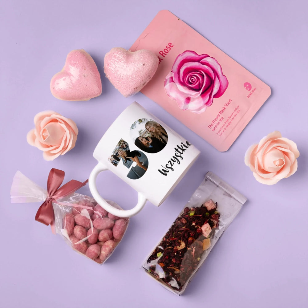 Piękny zestaw prezentowy z kubkiem z wybraną przez Ciebie personalizacją oraz dodatkami niezbędnymi do różanego spa.