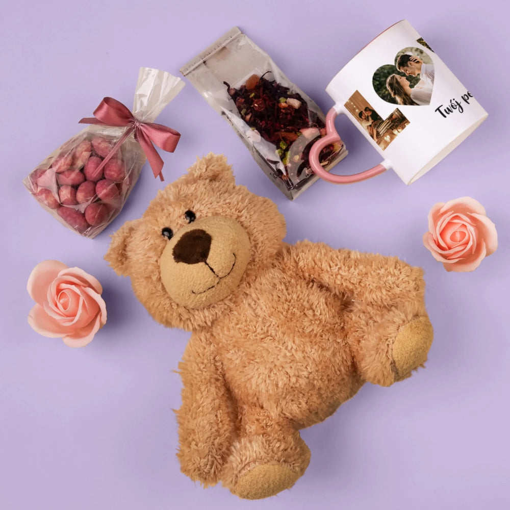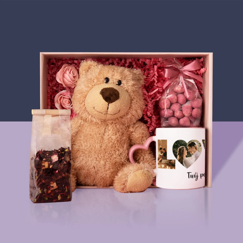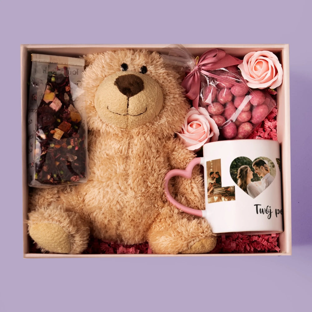 Piękny zestaw prezentowy z kubkiem z wybraną przez Ciebie personalizacją oraz uroczym misiem i słodkościami.