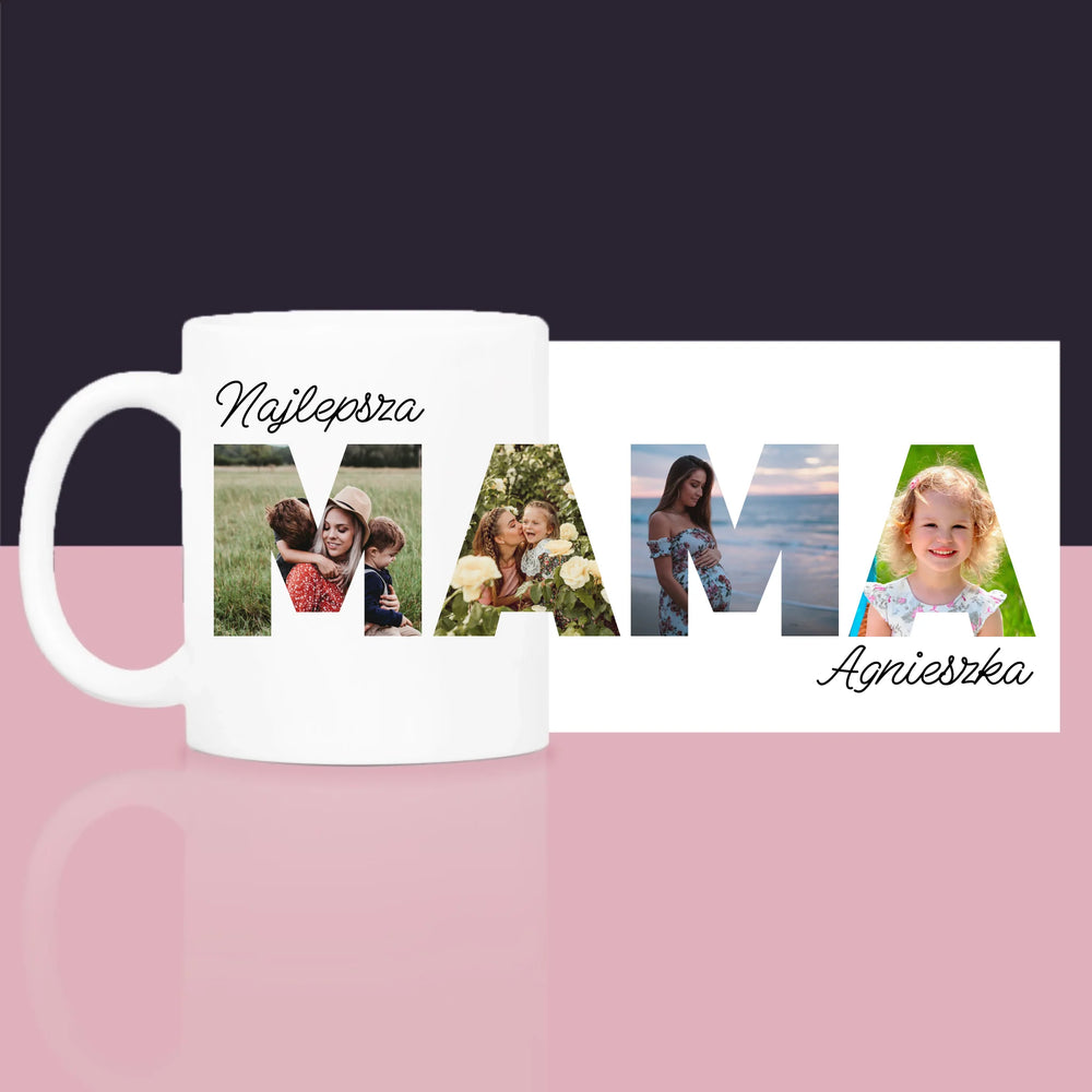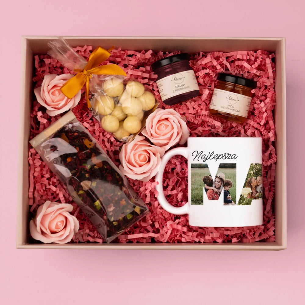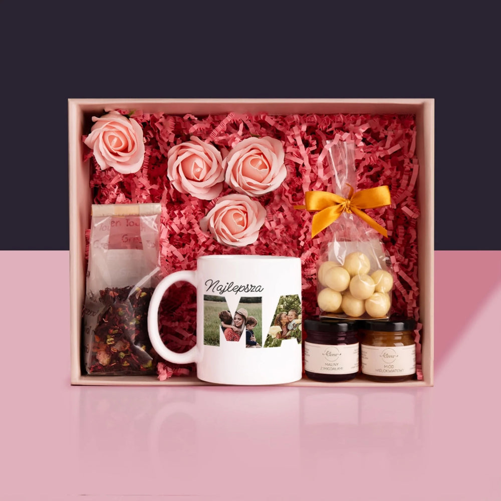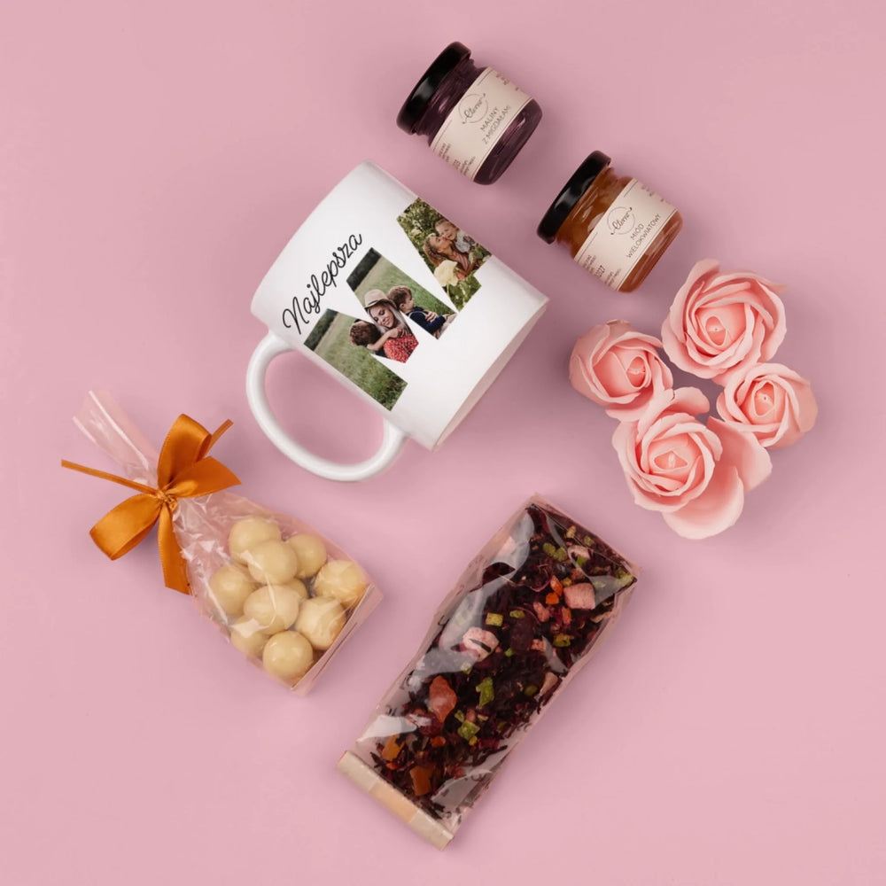 Słowo Ze Zdjęć: Mama - Zestaw prezentowy z kubkiem, herbatą i słodkościami